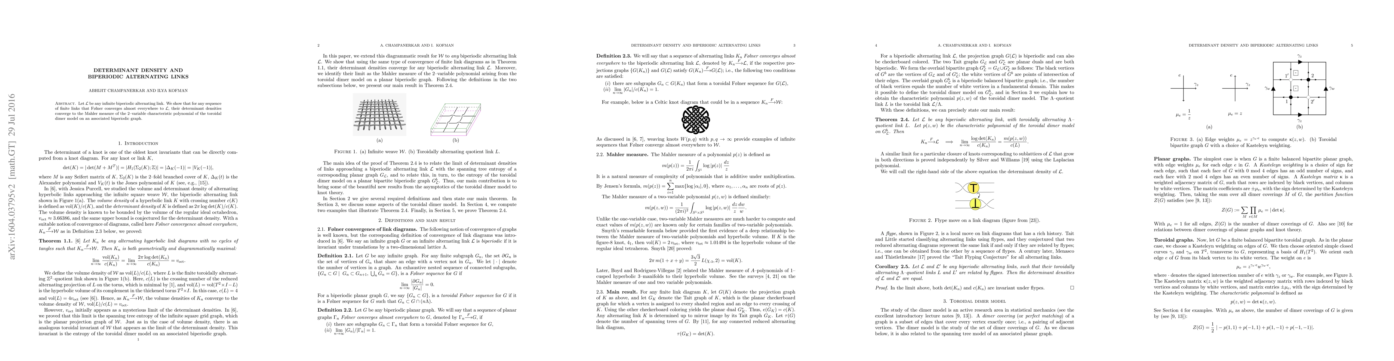 Let L be any infinite biperiodic alternating link. We show that for any sequence of finite links that Folner converges almost everywhere to L, their determinant densities converge to the Mahler measure of the 2-variable characteristic polynomial of the toroidal dimer model on an associated biperiodic graph.