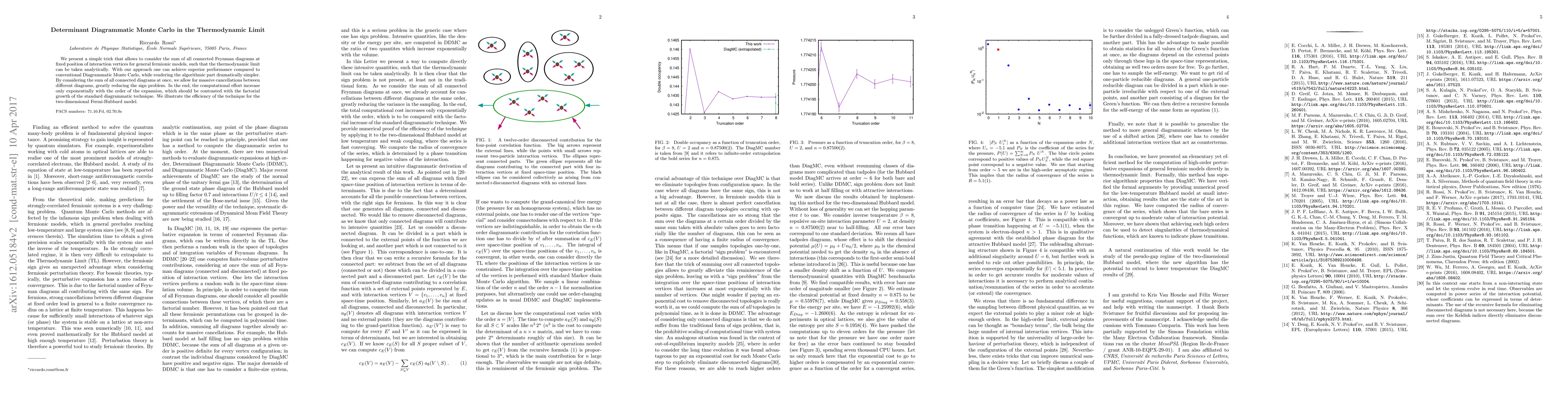 This research introduces a new method, Determinant Diagrammatic Monte Carlo, that significantly improves computational efficiency for fermionic models in the thermodynamic limit. By summing all connected diagrams at fixed interaction vertex positions, it simplifies algorithmic parts, mitigates the sign problem, and reduces computational complexity from factorial to exponential growth with the expansion order. The technique's effectiveness is demonstrated using the two-dimensional Fermi-Hubbard model.