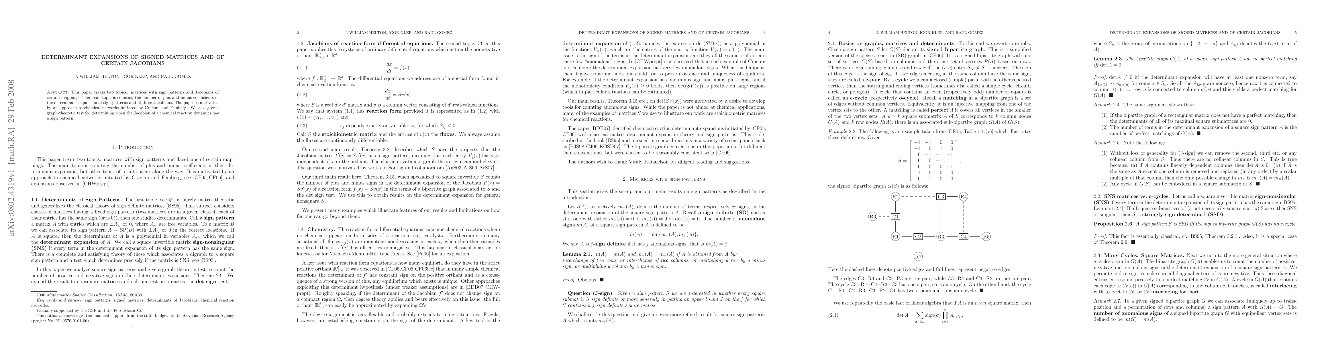 This paper treats two topics: matrices with sign patterns and Jacobians of certain mappings. The main topic is counting the number of plus and minus coefficients in the determinant expansion of sign patterns and of these Jacobians. The paper is motivated by an approach to chemical networks initiated by Craciun and Feinberg. We also give a graph-theoretic test for determining when the Jacobian of a chemical reaction dynamics has a sign pattern.