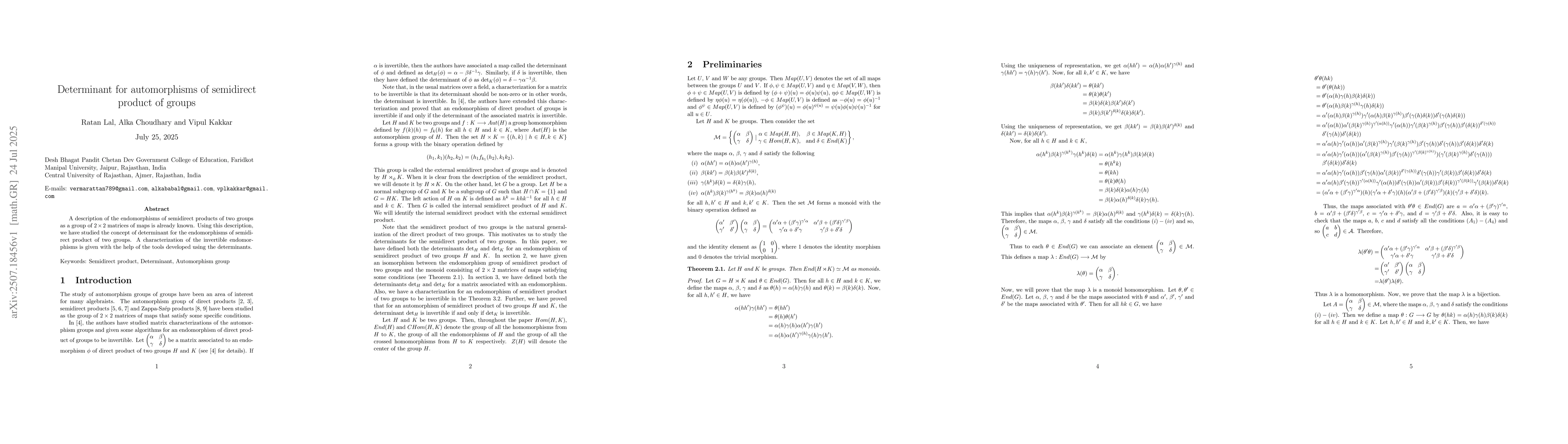 A description of the endomorphisms of semidirect products of two groups as a group of $2\times 2$ matrices of maps is already known. Using this description, we have studied the concept of determinant for the endomorphisms of semidirect product of two groups. A characterization of the invertible endomorphisms is given with the help of the tools developed using the determinants.