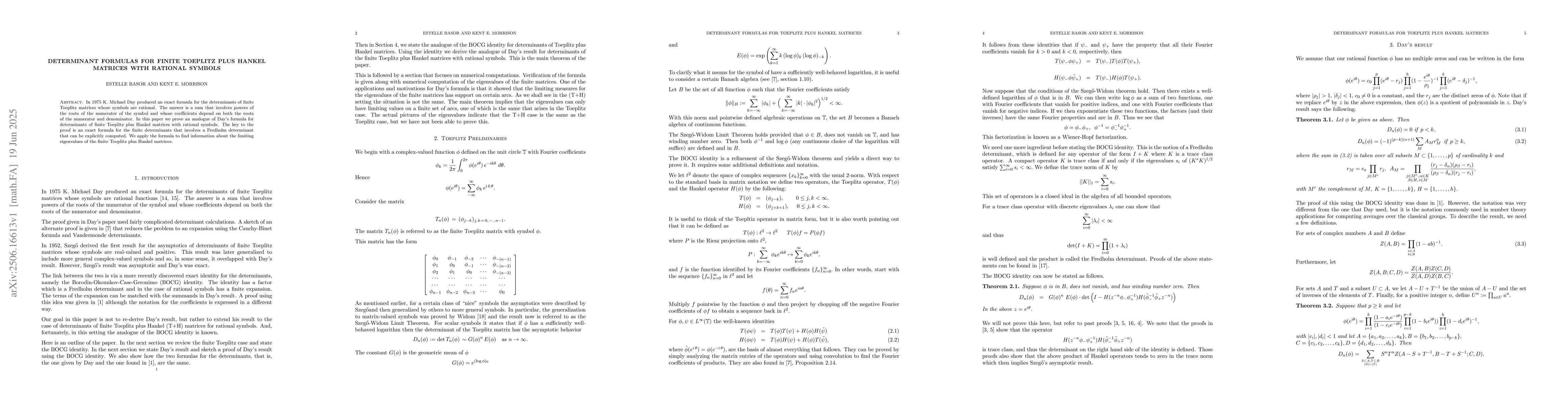 In 1975 K. Michael Day produced an exact formula for the determinants of finite Toeplitz matrices whose symbols are rational. The answer is a sum that involves powers of the roots of the numerator of the symbol and whose coefficients depend on both the roots of the numerator and denominator. In this paper we prove an analogue of Day's formula for determinants of finite Toeplitz plus Hankel matrices with rational symbols. The key to the proof is an exact formula for the finite determinants that involves a Fredholm determinant that can be explicitly computed. We apply the formula to find information about the limiting eigenvalues of the finite Toeplitz plus Hankel matrices.
