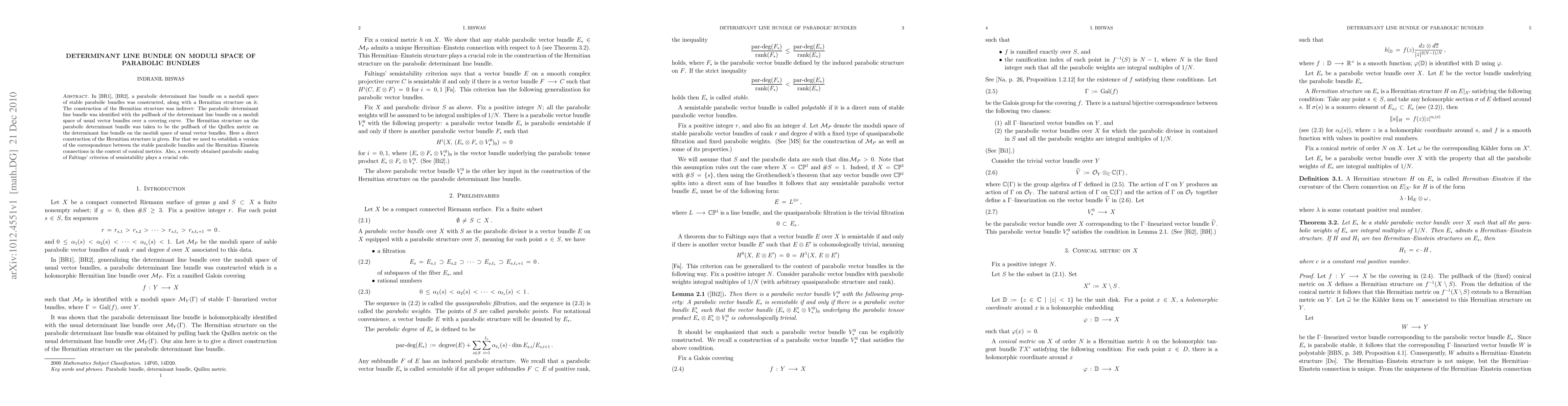 This paper constructs a direct Hermitian structure on the determinant line bundle over the moduli space of stable parabolic bundles, utilizing a correspondence between stable parabolic bundles and Hermitian-Einstein connections within conical metrics, and applying a parabolic analog of Faltings' criterion of semistability.
