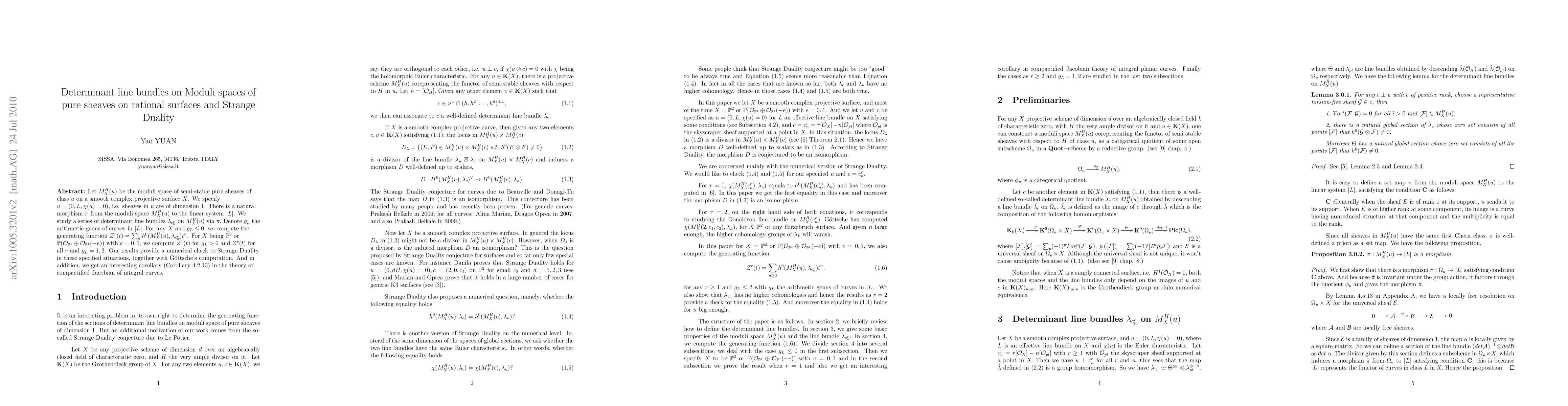 This research paper studies determinant line bundles on moduli spaces of pure sheaves on rational surfaces, providing numerical checks to Strange Duality and new insights into the theory of compactified Jacobian of integral curves.