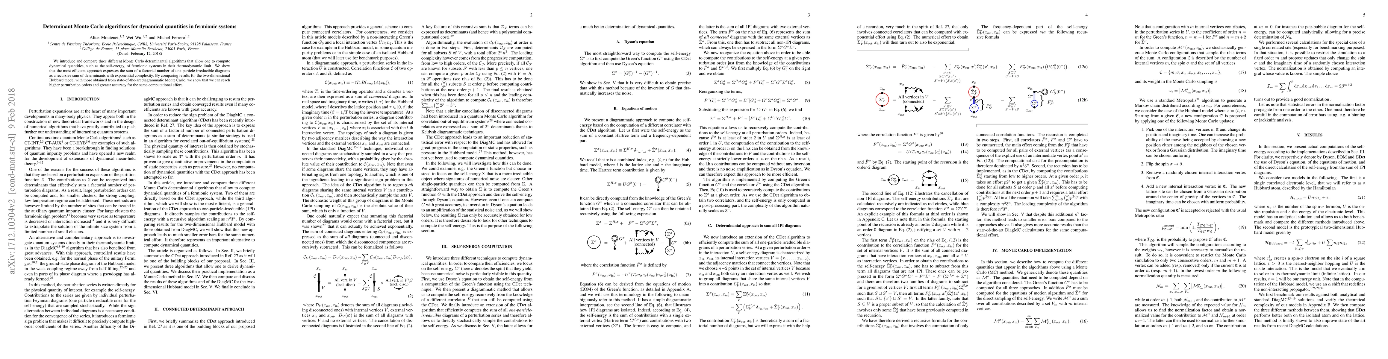 This paper introduces three Monte Carlo determinantal algorithms for computing dynamical quantities in fermionic systems, demonstrating that the most efficient method expresses complex sums as recursive determinant calculations. The proposed approach achieves higher perturbation orders and greater accuracy compared to state-of-the-art methods, as shown through simulations of the two-dimensional Hubbard model.