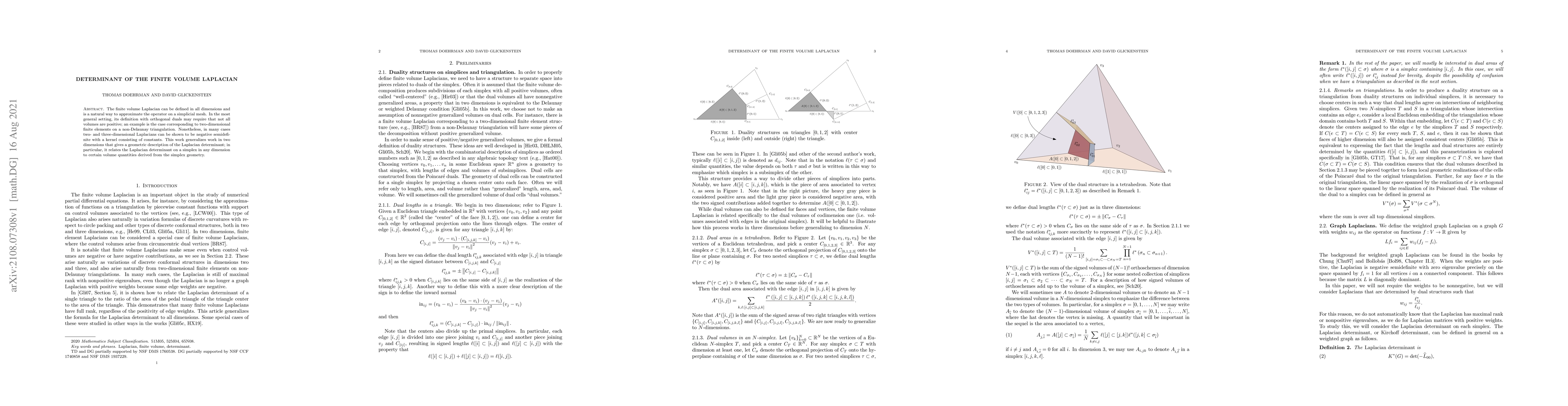 This paper explores the finite volume Laplacian defined on simplicial meshes, showing that it can be negative semidefinite in two and three dimensions. It generalizes previous work to provide a geometric interpretation of the Laplacian determinant in terms of volume quantities derived from simplex geometry.