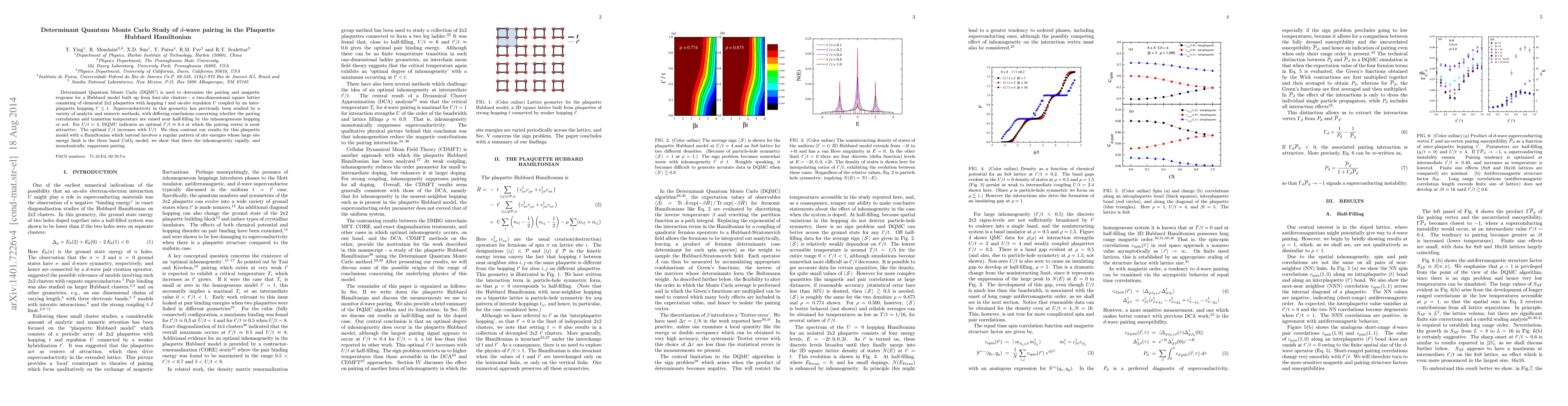 Determinant Quantum Monte Carlo (DQMC) is used to determine the pairing and magnetic response for a Hubbard model built up from four-site clusters -a two-dimensional square lattice consisting of elemental 2x2 plaquettes with hopping $t$ and on-site repulsion $U$ coupled by an inter-plaquette hopping $t' \leq t$. Superconductivity in this geometry has previously been studied by a variety of analytic and numeric methods, with differing conclusions concerning whether the pairing correlations and transition temperature are raised near half-filling by the inhomogeneous hopping or not. For $U/t=4$, DQMC indicates an optimal $t'/t \approx 0.4$ at which the pairing vertex is most attractive. The optimal $t'/t$ increases with $U/t$. We then contrast our results for this plaquette model with a Hamiltonian which instead involves a regular pattern of site energies whose large site energy limit is the three band CuO$_2$ model; we show that there the inhomogeneity rapidly, and monotonically, suppresses pairing.