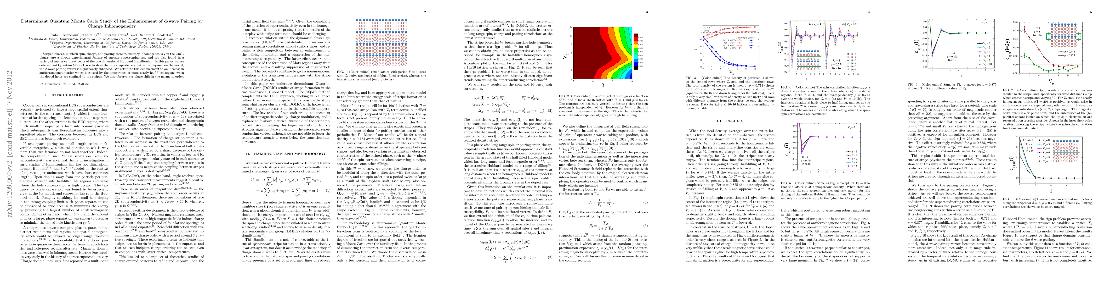 This study employs determinant Quantum Monte Carlo to demonstrate that charge inhomogeneity in the form of stripe patterns enhances d-wave pairing in cuprate superconductors, attributing the effect to increased antiferromagnetic order and a π-phase shift in magnetic order due to the confinement of doped holes.