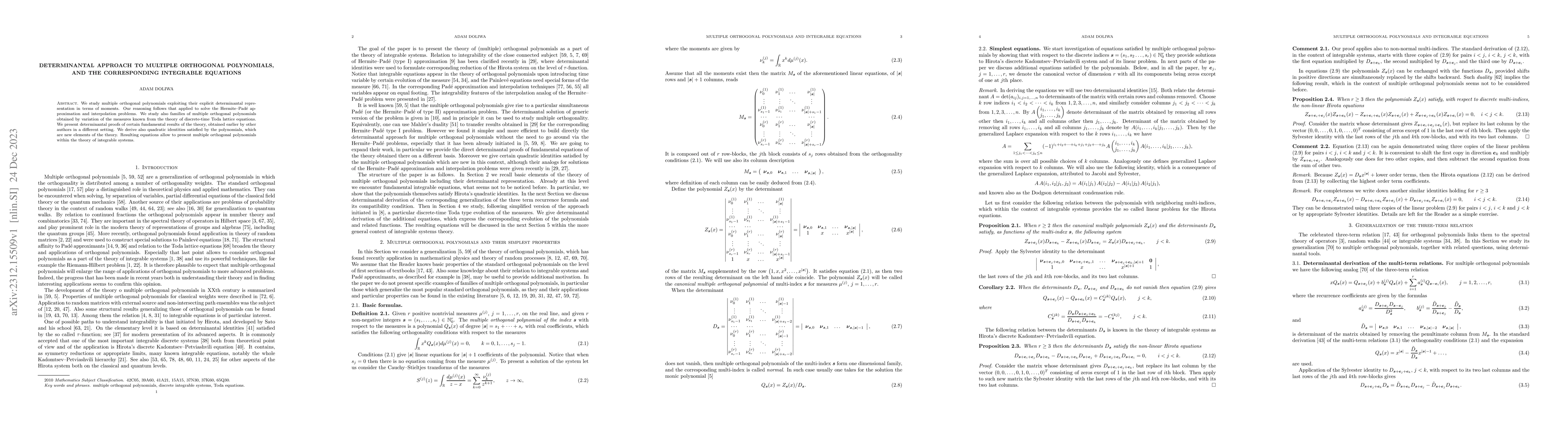 Summary: This paper investigates multiple orthogonal polynomials through a determinantal representation based on moments, deriving new quadratic identities and linking these polynomials to integrable systems akin to discrete-time Toda lattice equations. It presents novel determinantal proofs for established results and new findings.