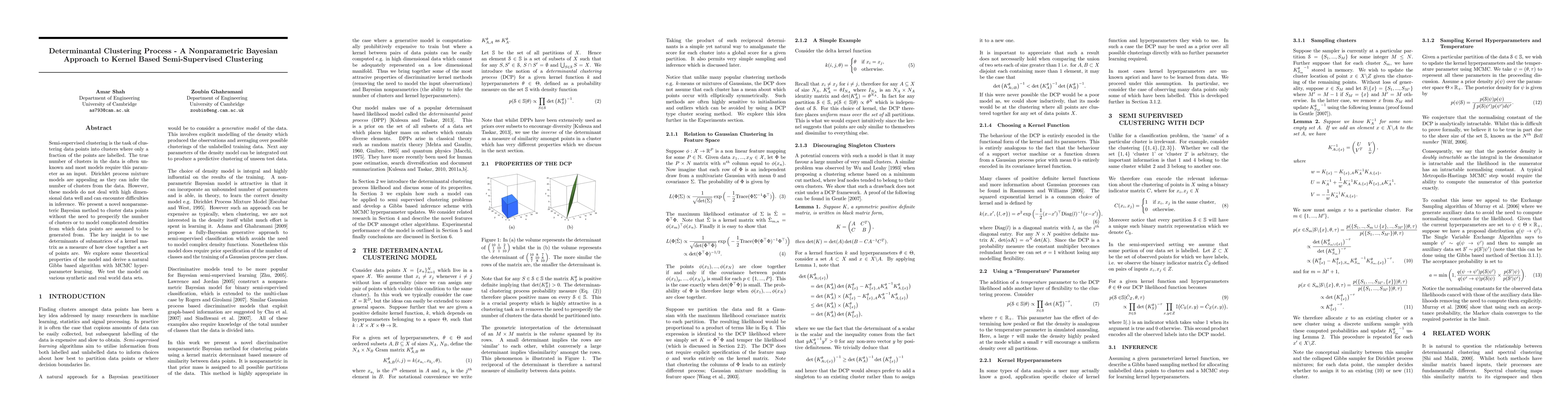 This paper presents a nonparametric Bayesian method for semi-supervised clustering that infers cluster numbers from data without requiring manual specification. It uses determinants of kernel matrices to measure point proximity.