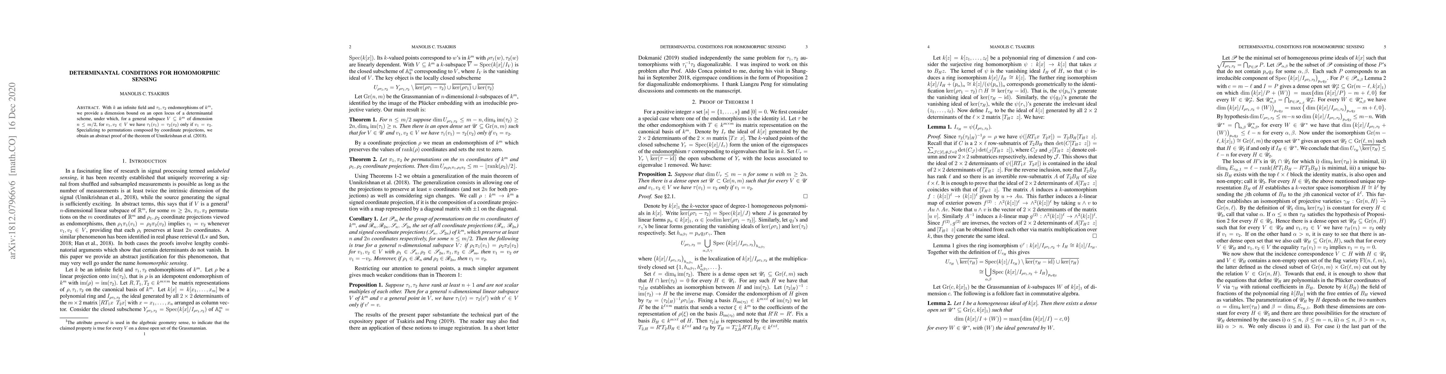With $k$ an infinite field and $\tau_1,\tau_2$ endomorphisms of $k^m$, we provide a dimension bound on an open locus of a determinantal scheme, under which, for a general subspace $V \subseteq k^m$ of dimension $n \le m/2$, for $v_1,v_2 \in V$ we have $\tau_1(v_1)=\tau_2(v_2)$ only if $v_1=v_2$. Specializing to permutations composed by coordinate projections, we obtain an abstract proof of the unlabeled sensing theorem.