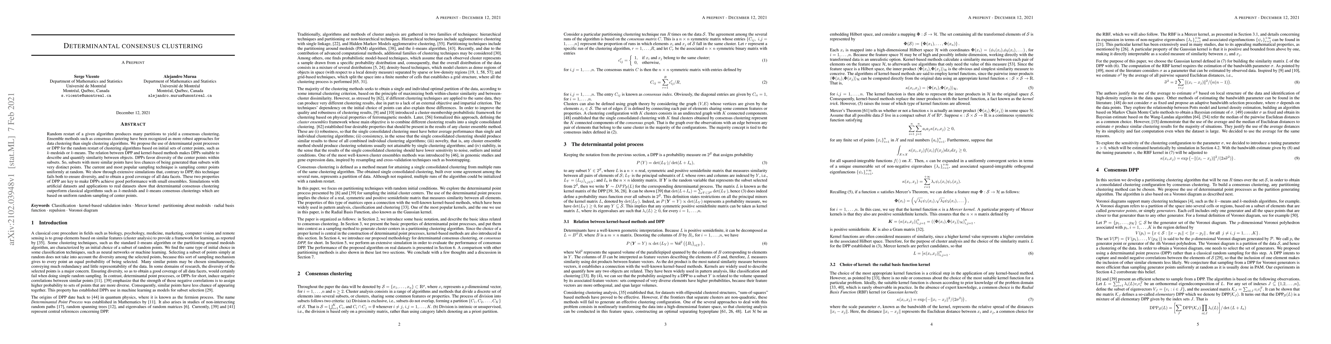 This paper proposes determinantal point processes (DPP) for consensus clustering, which favors diverse center points to enhance robustness. Unlike uniform random sampling, DPP ensures diversity and better data coverage, leading to superior performance in clustering tasks, as demonstrated through simulations and real-world applications.