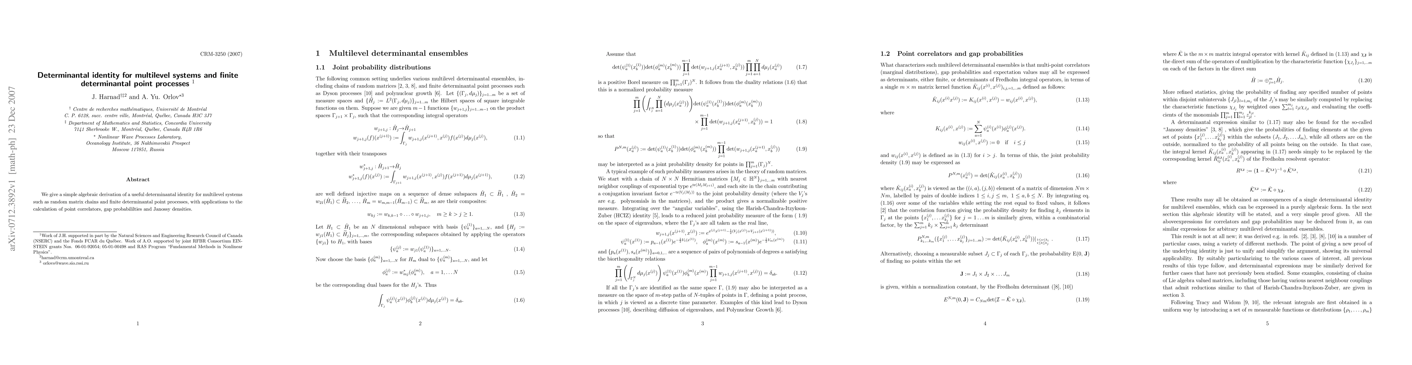 **Summary:** This paper presents an algebraic derivation of a determinantal identity applicable to multilevel systems like random matrix chains and finite determinantal point processes, and utilizes it for calculating point correlators, gap probabilities, and Janossy densities.