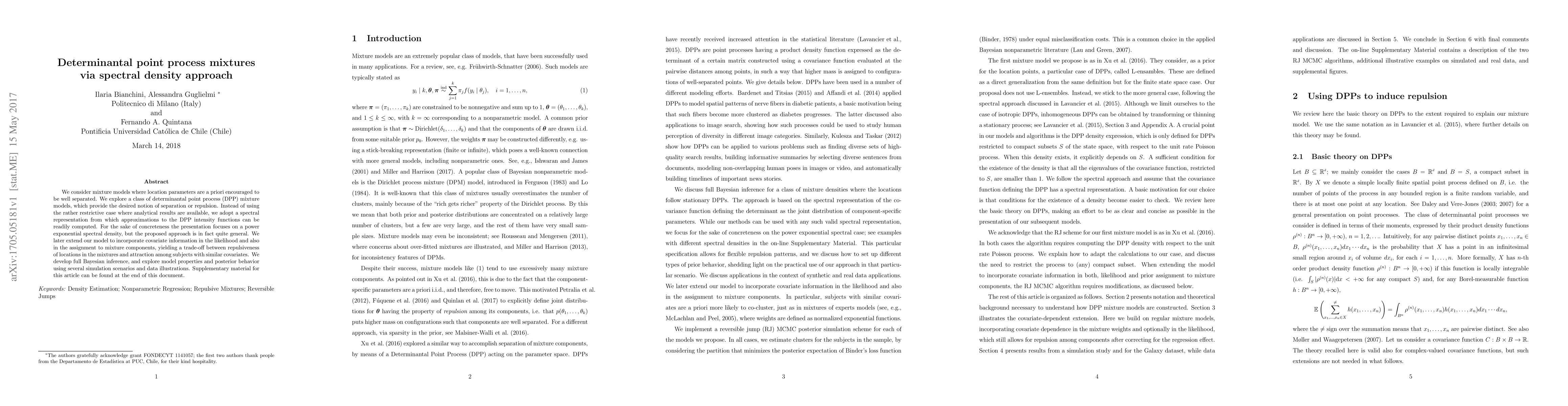 This paper proposes a spectral density approach for mixture models of determinantal point processes (DPPs) that encourages separation among location parameters. It utilizes a power exponential spectral density for approximation and extends the model to incorporate covariate information, balancing repulsion among locations and attraction among similar subjects. The study includes full Bayesian inference and explores model properties through simulations and data illustrations.