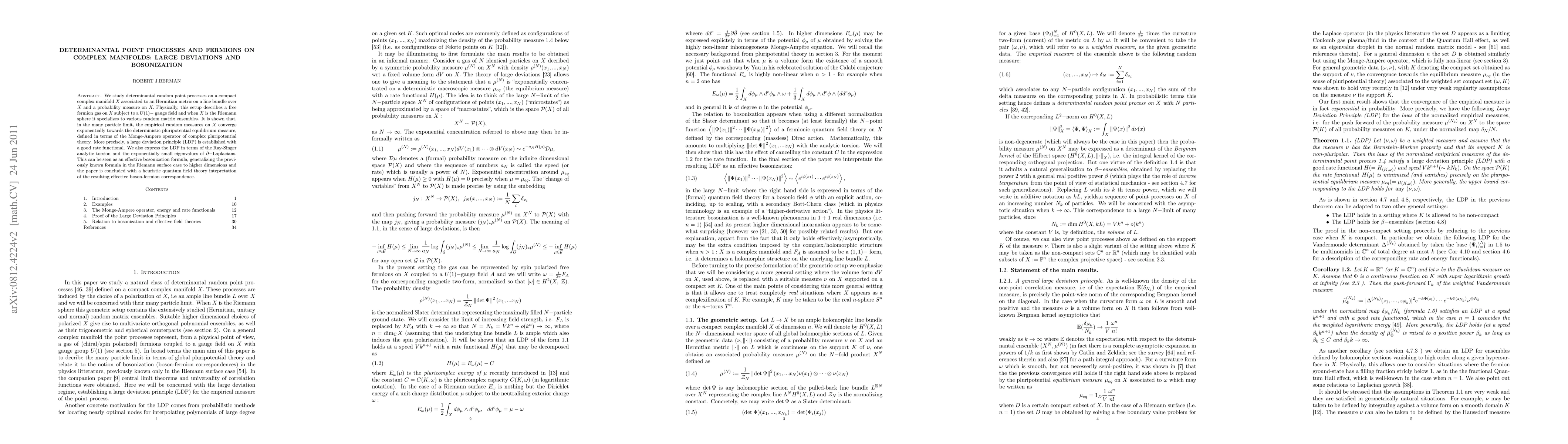 This paper explores determinantal point processes on complex manifolds, showing that they describe a free fermion gas under a U(1) gauge field. It establishes a large deviation principle for these processes, linking them to the equilibrium measure and bosonization, with implications for random matrix ensembles and quantum field theory.