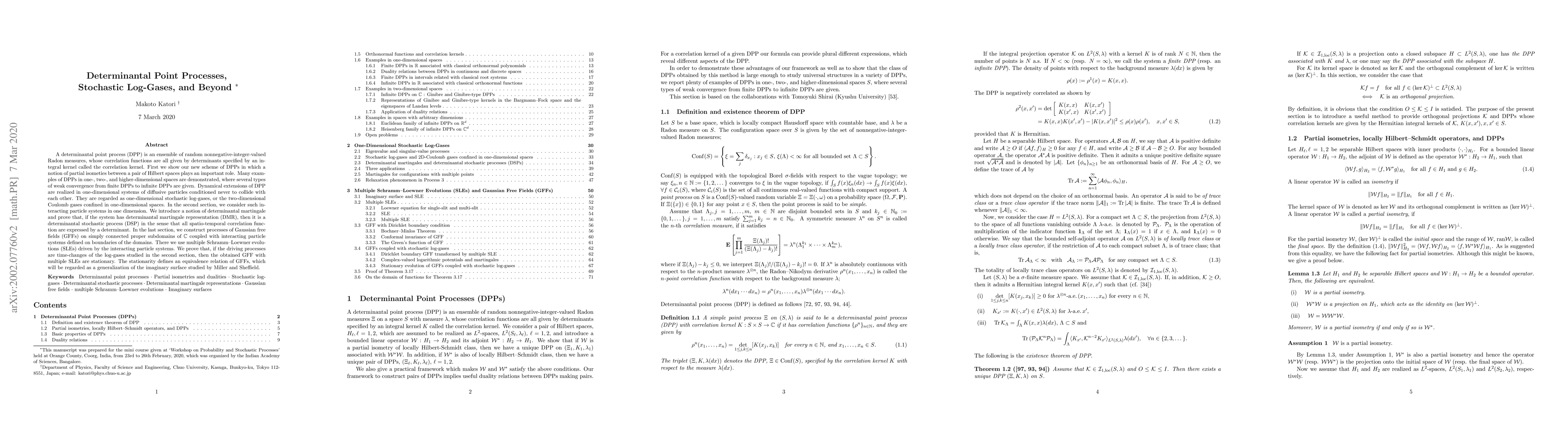A determinantal point process (DPP) is an ensemble of random nonnegative-integer-valued Radon measures, whose correlation functions are all given by determinants specified by an integral kernel called the correlation kernel. First we show our new scheme of DPPs in which a notion of partial isometies between a pair of Hilbert spaces plays an important role. Many examples of DPPs in one-, two-, and higher-dimensional spaces are demonstrated, where several types of weak convergence from finite DPPs to infinite DPPs are given. Dynamical extensions of DPP are realized in one-dimensional systems of diffusive particles conditioned never to collide with each other. They are regarded as one-dimensional stochastic log-gases, or the two-dimensional Coulomb gases confined in one-dimensional spaces. In the second section, we consider such interacting particle systems in one dimension. We introduce a notion of determinantal martingale and prove that, if the system has determinantal martingale representation (DMR), then it is a determinantal stochastic process (DSP) in the sense that all spatio-temporal correlation function are expressed by a determinant. In the last section, we construct processes of Gaussian free fields (GFFs) on simply connected proper subdomains of $\mathbb{C}$ coupled with interacting particle systems defined on boundaries of the domains. There we use multiple Schramm--Loewner evolutions (SLEs) driven by the interacting particle systems. We prove that, if the driving processes are time-changes of the log-gases studied in the second section, then the obtained GFF with multiple SLEs are stationary. The stationarity defines an equivalence relation of GFFs, which will be regarded as a generalization of the imaginary surface studied by Miller and Sheffield.