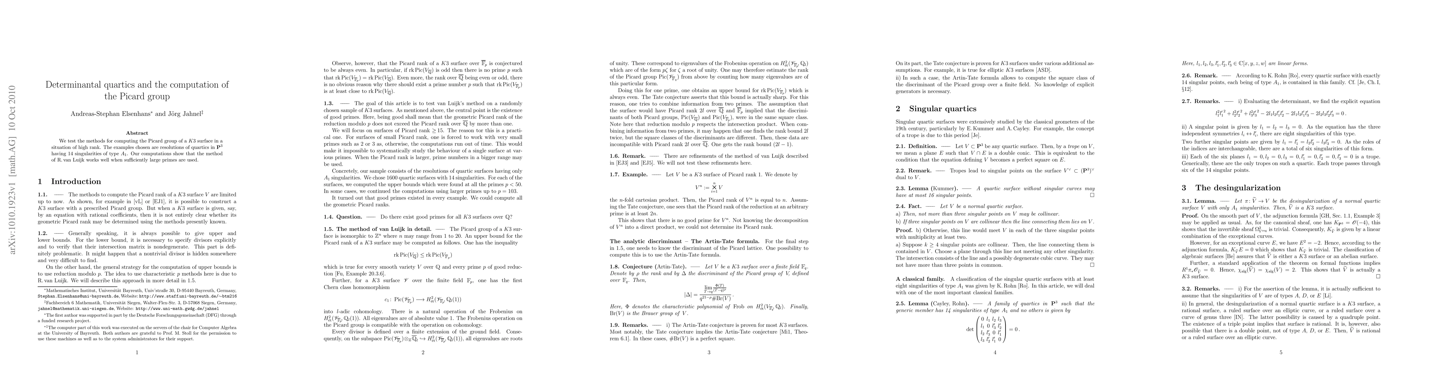 We test the methods for computing the Picard group of a $K3$ surface in a situation of high rank. The examples chosen are resolutions of quartics in $\bP^3$ having 14 singularities of type $A_1$. Our computations show that the method of R. van Luijk works well when sufficiently large primes are used.