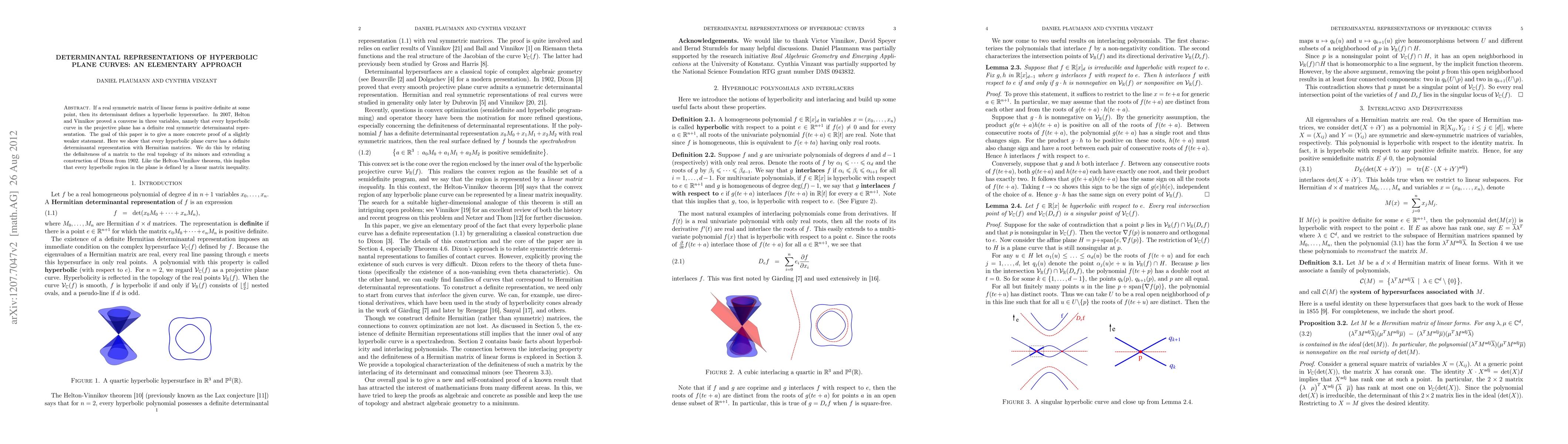 This paper provides an elementary proof that every hyperbolic plane curve can be represented by a determinant of Hermitian matrices, extending Dixon's 1902 construction and linking matrix definiteness to the real topology of its minors. This result mirrors Helton and Vinnikov's theorem, confirming that hyperbolic regions in the plane are defined by linear matrix inequalities.