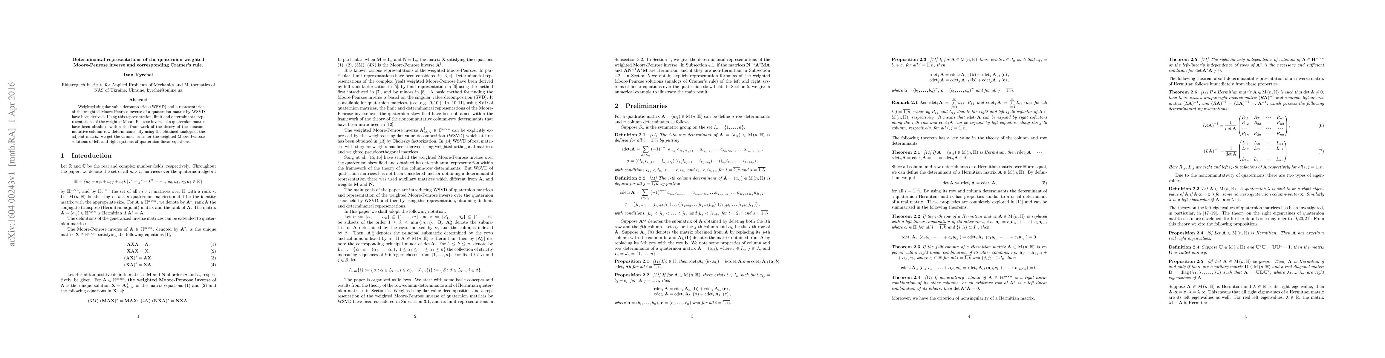 The paper derives the weighted Moore-Penrose inverse of a quaternion matrix using weighted singular value decomposition and noncommutative determinants, providing determinantal representations and Cramer's rules for solving quaternion linear equations.