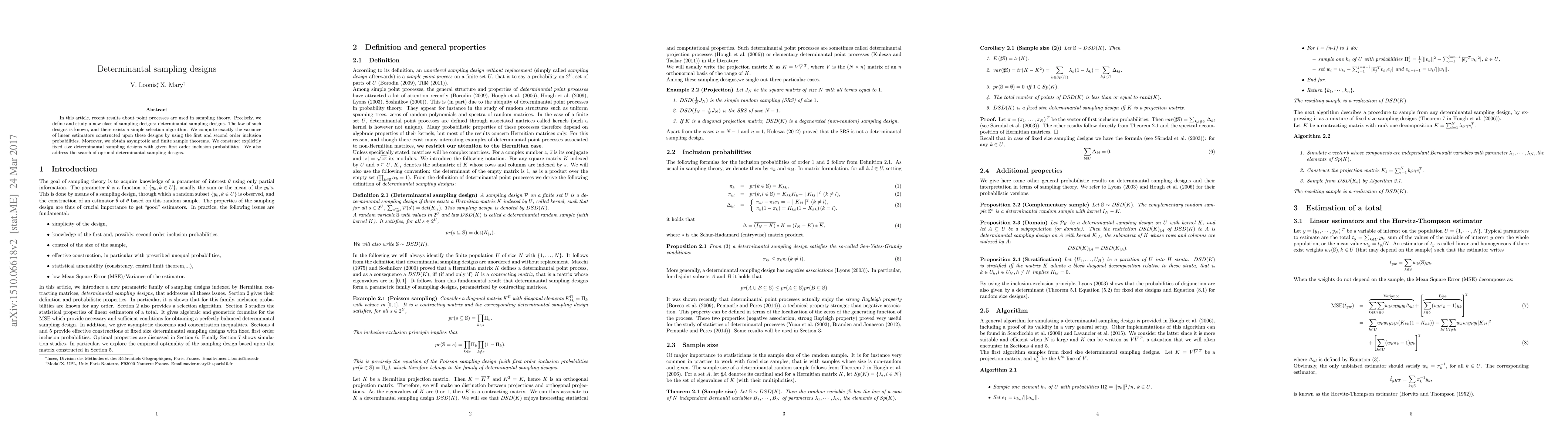 This paper introduces determinantal sampling designs, a novel class leveraging point processes in sampling theory. It provides a simple selection algorithm and computes the variance of linear estimators, offering both asymptotic and finite sample theorems, and constructs explicit fixed-size designs with specified inclusion probabilities.