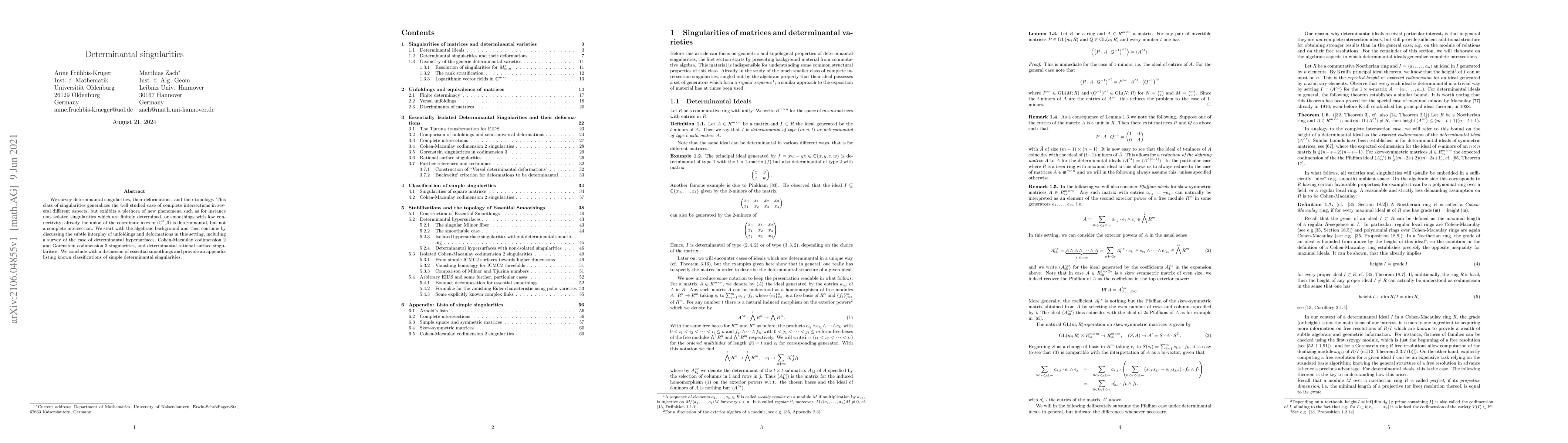 This paper surveys determinantal singularities, highlighting their unique properties such as non-isolated finitely determined singularities and low connectivity smoothings. It delves into algebraic background, deformations, and the intricate relationship between unfoldings and deformations, particularly focusing on determinantal hypersurfaces and certain codimension singularities.