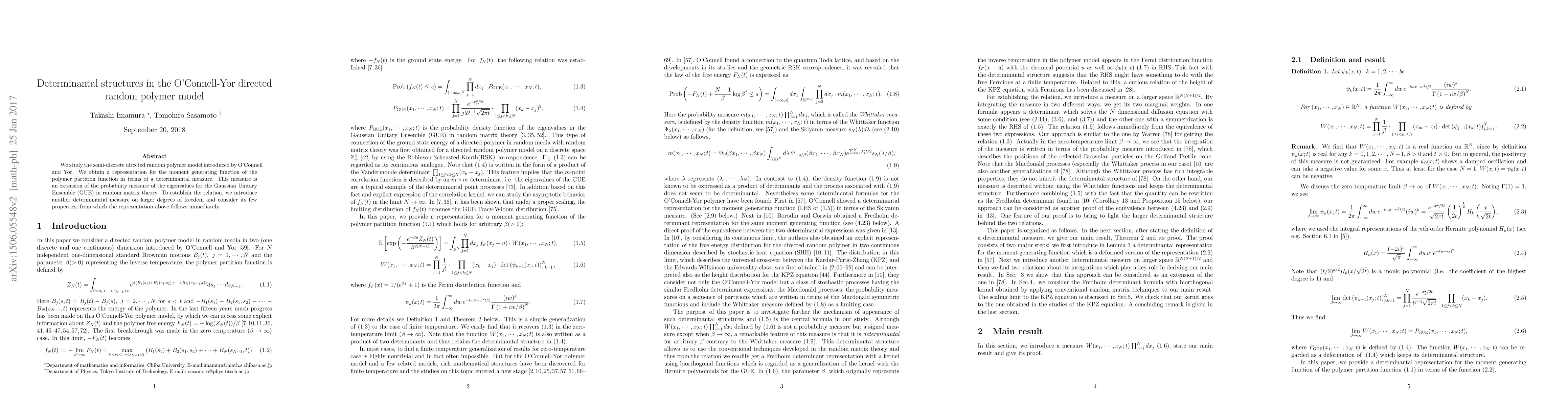 This paper explores the semi-discrete directed random polymer model, deriving a determinantal representation for its moment generating function. This representation extends the Gaussian Unitary Ensemble (GUE) probability measure from random matrix theory, facilitated by introducing an additional determinantal measure.