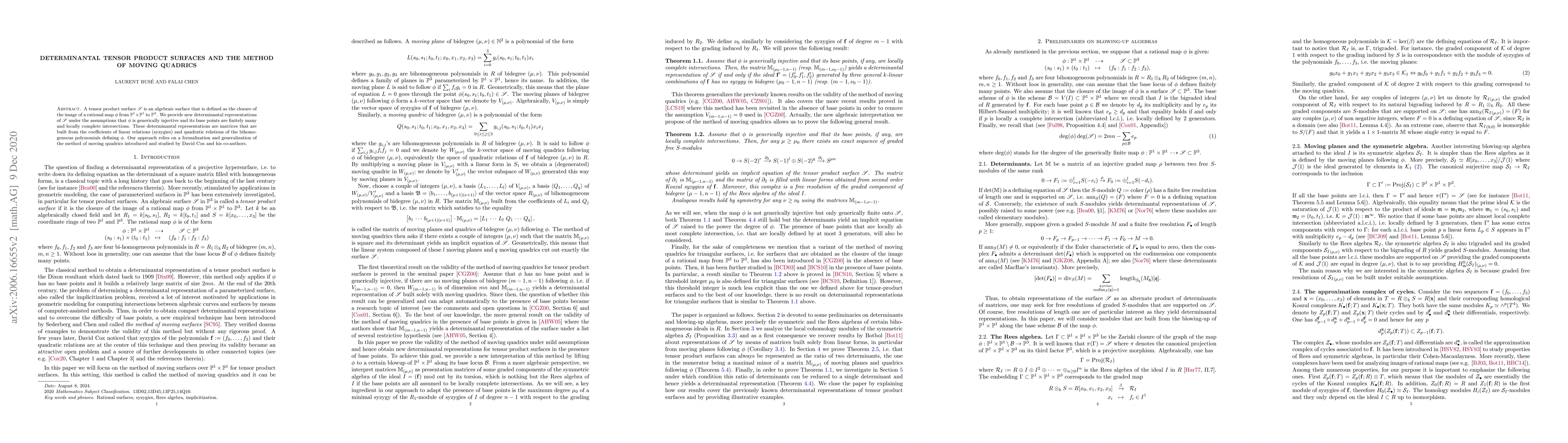 A tensor product surface $\mathscr{S}$ is an algebraic surface that is defined as the closure of the image of a rational map $\phi$ from $\mathbb{P}^1\times \mathbb{P}^1$ to $\mathbb{P}^3$. We provide new determinantal representations of $\mathscr{S}$ under the assumptions that $\phi$ is generically injective and its base points are finitely many and locally complete intersections. These determinantal representations are matrices that are built from the coefficients of linear relations (syzygies) and quadratic relations of the bihomogeneous polynomials defining $\phi$. Our approach relies on a formalization and generalization of the method of moving quadrics introduced and studied by David Cox and his co-authors.