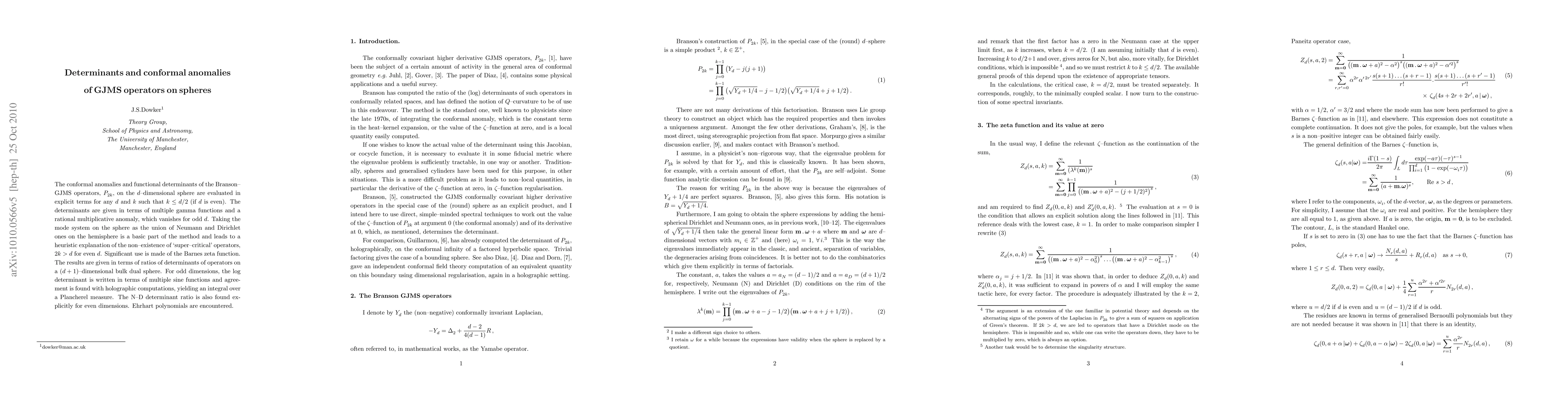The conformal anomalies and functional determinants of the Branson--GJMS operators, P_{2k}, on the d-dimensional sphere are evaluated in explicit terms for any d and k such that k < d/2+1 (if d is even). The determinants are given in terms of multiple gamma functions and a rational multiplicative anomaly, which vanishes for odd d. Taking the mode system on the sphere as the union of Neumann and Dirichlet ones on the hemisphere is a basic part of the method and leads to a heuristic explanation of the non--existence of `super--critical' operators, 2k>d for even d. Significant use is made of the Barnes zeta function. The results are given in terms of ratios of determinants of operators on a (d+1)-dimensional bulk dual sphere. For odd dimensions, the log determinant is written in terms of multiple sine functions and agreement is found with holographic computations, yielding an integral over a Plancherel measure. The N-D determinant ratio is also found explicitly for even dimensions. Ehrhart polynomials are encountered.