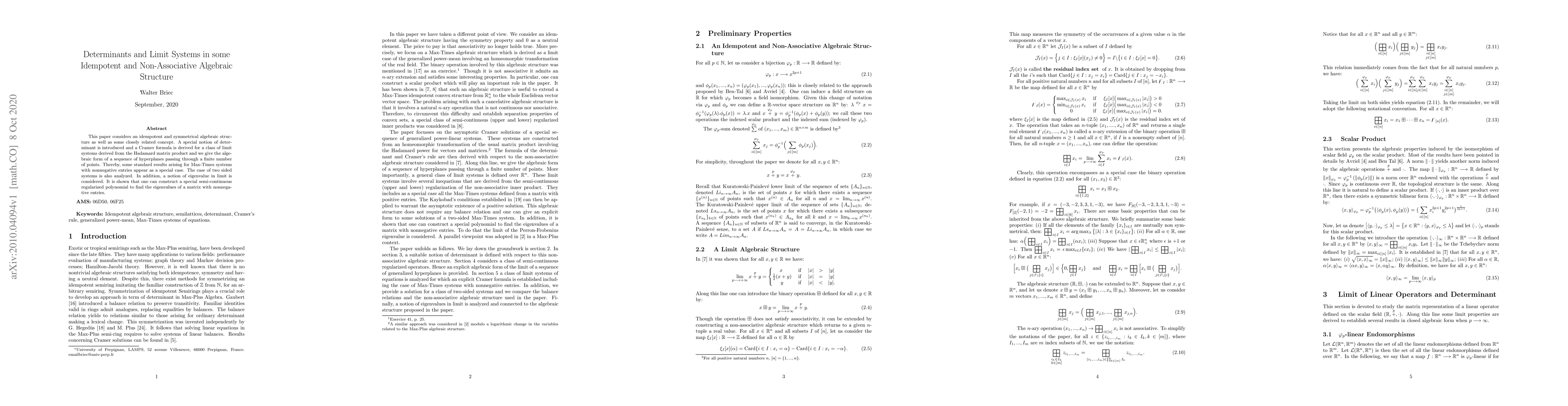 This paper considers an idempotent and symmetrical algebraic structure as well as some closely related concept. A special notion of determinant is introduced and a Cramer formula is derived for a class of limit systems derived from the Hadamard matrix product and we give the algebraic form of a sequence of hyperplanes passing through a finite number of points. Thereby, some standard results arising for Max-Times systems with nonnegative entries appear as a special case. The case of two sided systems is also analyzed. In addition, a notion of eigenvalue in limit is considered. It is shown that one can construct a special semi-continuous regularized polynomial to find the eigenvalues of a matrix with nonnegative entries.