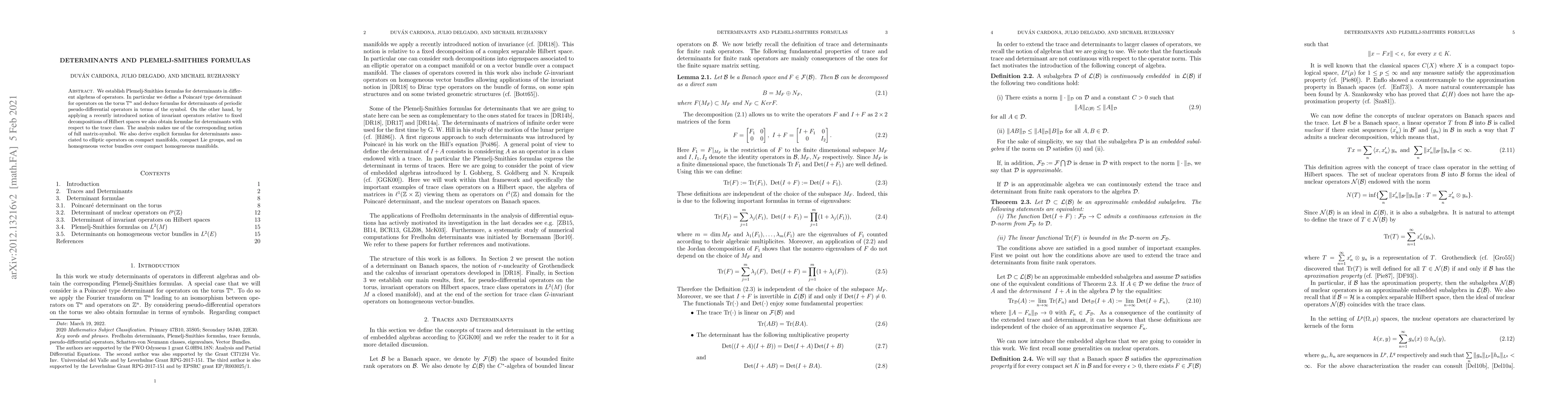 We establish Plemelj-Smithies formulas for determinants in different algebras of operators. In particular we define a Poincar\'e type determinant for operators on the torus $\Tn$ and deduce formulas for determinants of periodic pseudo-differential operators in terms of the symbol. On the other hand, by applying a recently introduced notion of invariant operators relative to fixed decompositions of Hilbert spaces we also obtain formulae for determinants with respect to the trace class. The analysis makes use of the corresponding notion of full matrix-symbol. We also derive explicit formulas for determinants associated to elliptic operators on compact manifolds, compact Lie groups, and on homogeneous vector bundles over compact homogeneous manifolds.