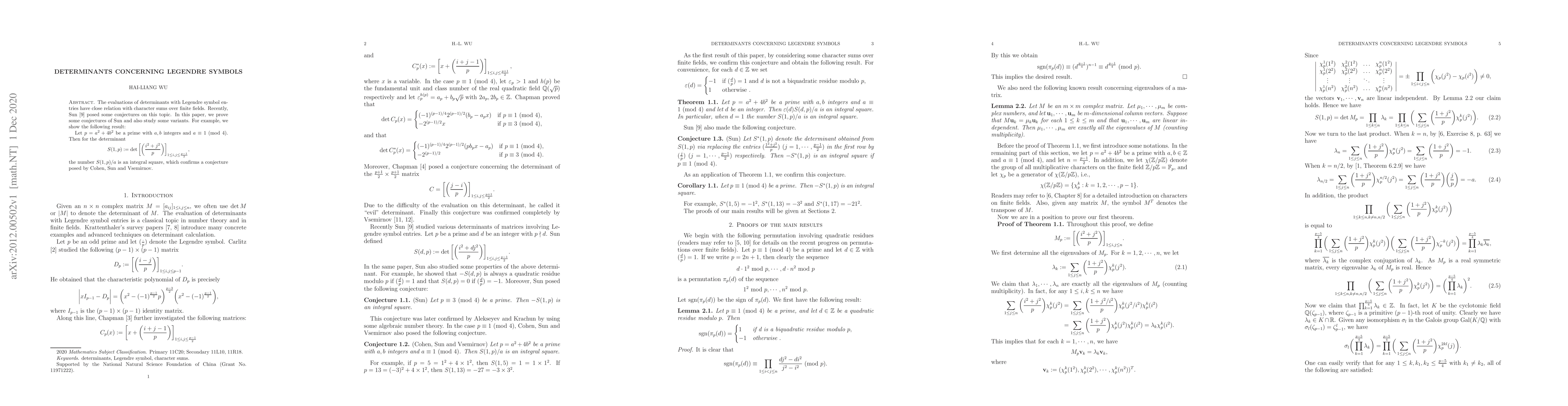 A research paper proves conjectures on a mathematical topic involving Legendre symbols and determinants, confirming a previous prediction and shedding light on their relationship to character sums over finite fields.
