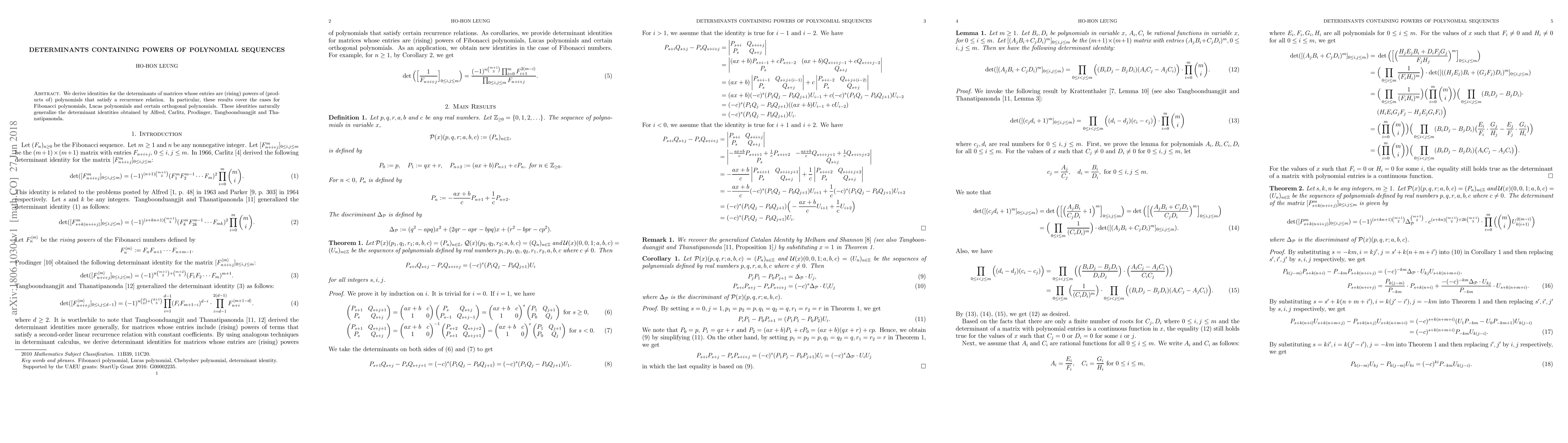 This paper derives determinant identities for matrices with entries that are rising powers of polynomial sequences, including Fibonacci, Lucas, and orthogonal polynomials. These results generalize previous determinant identities established by several researchers.