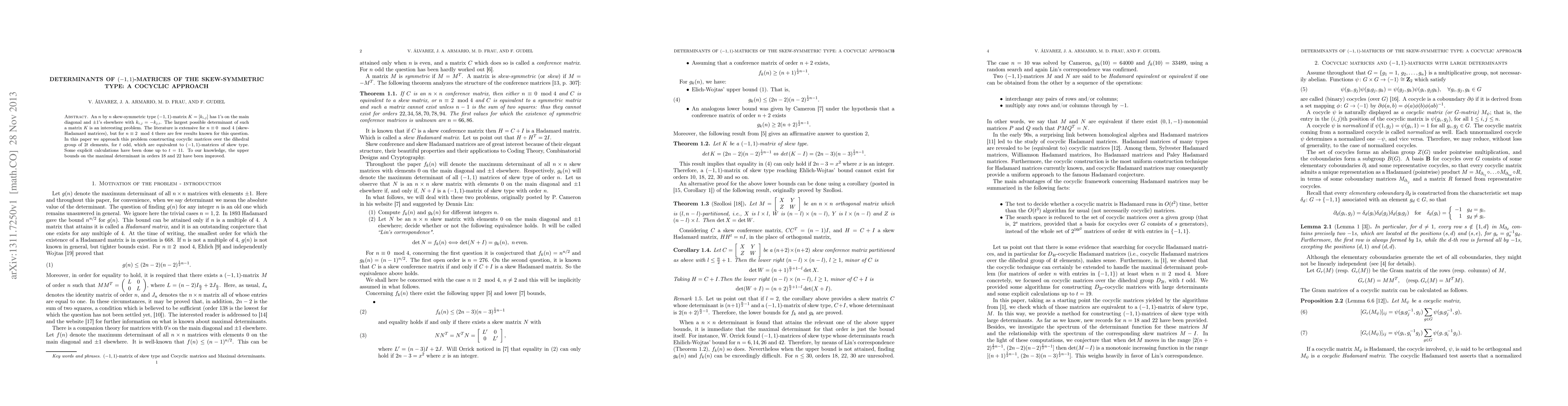 This paper explores the determinants of $(-1,1)$-matrices of skew-symmetric type, focusing on cocyclic matrices over the dihedral group for odd $t$. It provides improved upper bounds for the maximal determinant in orders 18 and 22, extending previous results for matrices where $n\equiv 2\mod 4$.