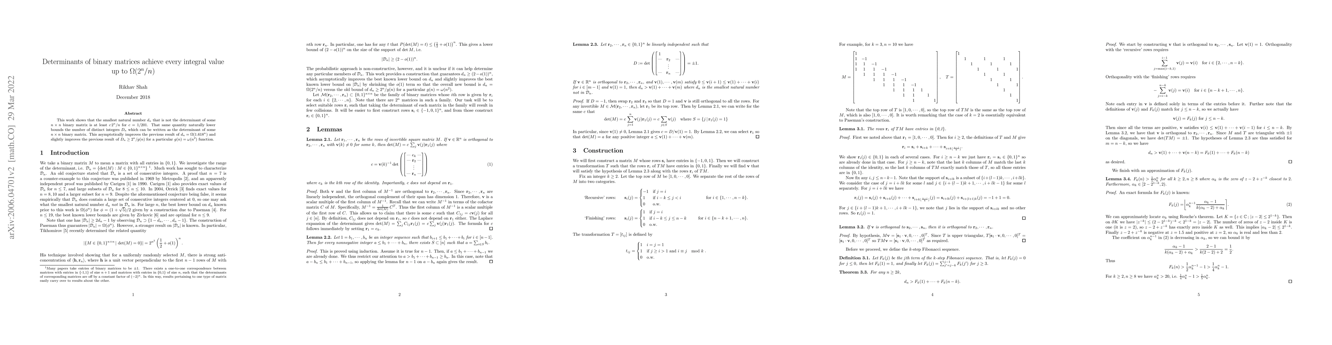 This work shows that the smallest natural number $d_n$ that is not the determinant of some $n\times n$ binary matrix is at least $c\,2^n/n$ for $c=1/201$. That same quantity naturally lower bounds the number of distinct integers $D_n$ which can be written as the determinant of some $n\times n$ binary matrix. This asymptotically improves the previous result of $d_n=\Omega(1.618^n)$ and slightly improves the previous result of $D_n\ge 2^n/g(n)$ for a particular $g(n)=\omega(n^2)$ function.