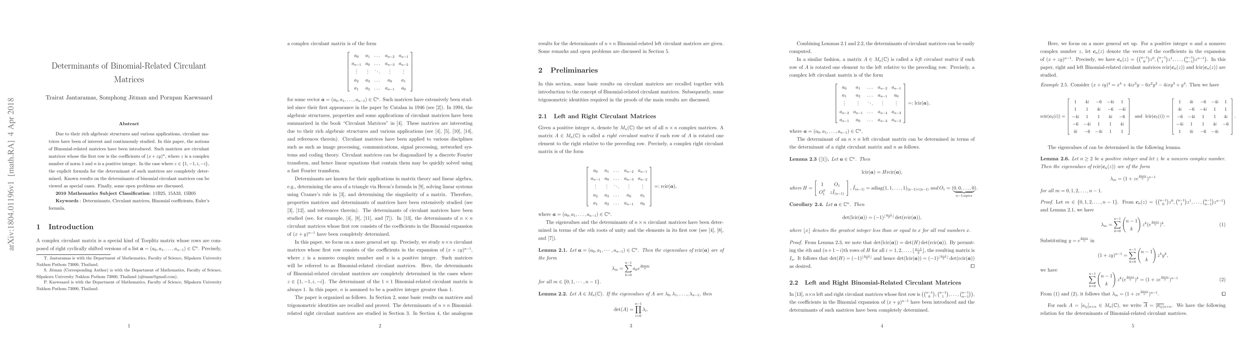 Due to their rich algebraic structures and various applications, circulant matrices have been of interest and continuously studied. In this paper, the notions of Binomial-related matrices have been introduced. Such matrices are circulant matrices whose the first row is the coefficients of $(x+zy)^n$, where $z$ is a complex number of norm $1$ and $n$ is a positive integer. In the case where $z\in \{1,-1,i,-i\}$, the explicit formula for the determinant of such matrices are completely determined. Known results on the determinants of binomial circulant matrices can be viewed as special cases. Finally, some open problems are discussed.
