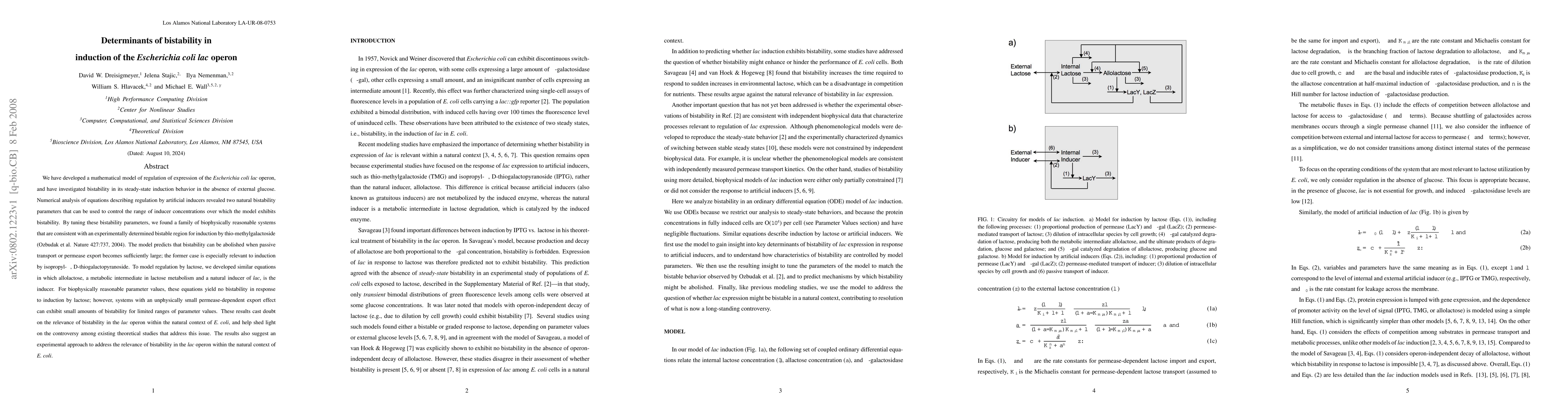 This paper develops a mathematical model to investigate bistability in the Escherichia coli lac operon's induction behavior, identifying two key parameters that control the range of inducer concentrations leading to bistability. The model suggests that bistability is unlikely in natural conditions due to factors like passive transport and permease export, casting doubt on its relevance in the natural context of E. coli.