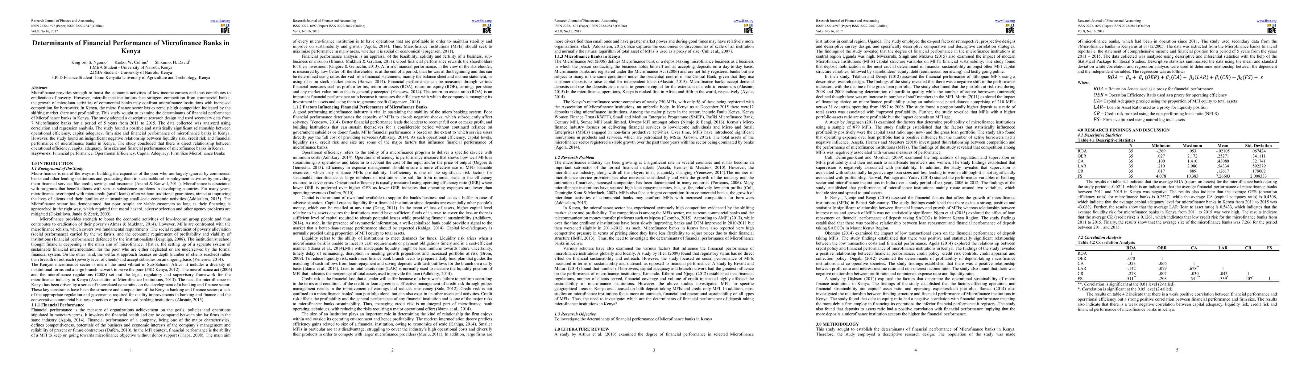 This study investigates the financial performance of microfinance banks in Kenya, finding that operational efficiency, capital adequacy, and firm size positively influence performance, while liquidity and credit risks show no significant negative impact. The research uses secondary data from 7 banks over 5 years, employing correlation and regression analysis.