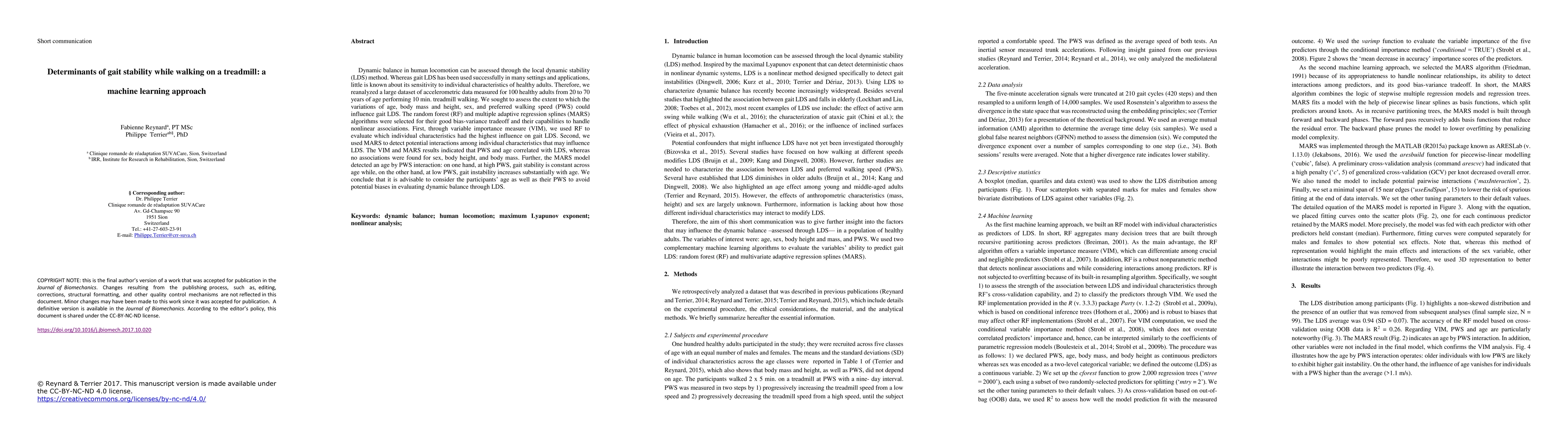 A machine learning approach was used to analyze data from 100 healthy adults walking on a treadmill, finding age and preferred walking speed to be significant factors in gait stability, with instability increasing with age at lower speeds.