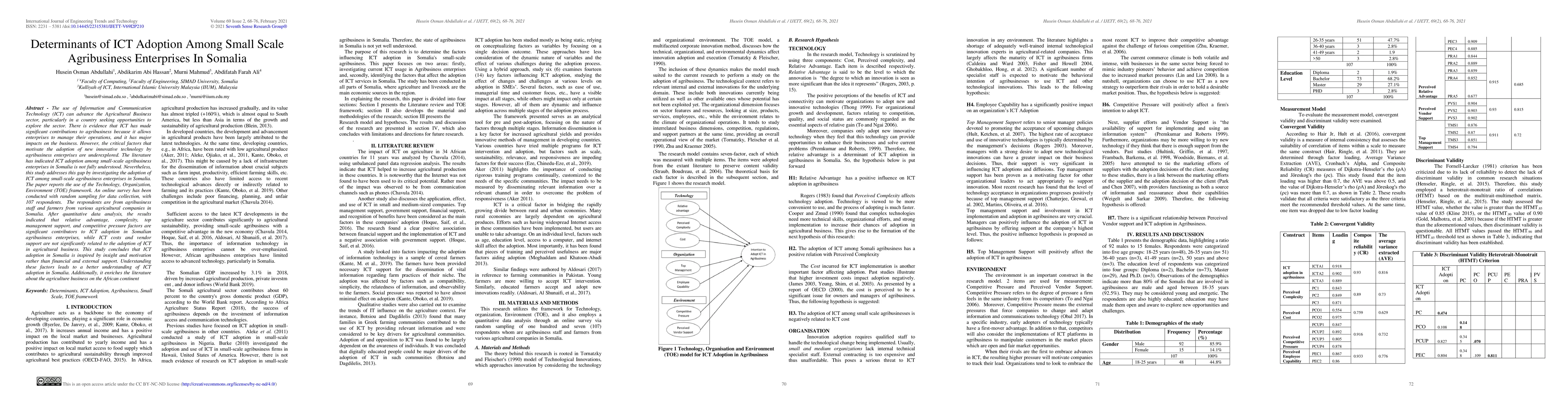 This study investigates the determinants of ICT adoption among small-scale agribusiness enterprises in Somalia using the TOE framework. Findings reveal that relative advantage, complexity, top management support, and competitive pressure significantly influence ICT adoption, while ICT costs and vendor support do not. The study emphasizes intrinsic motivation over financial and external factors in ICT adoption.