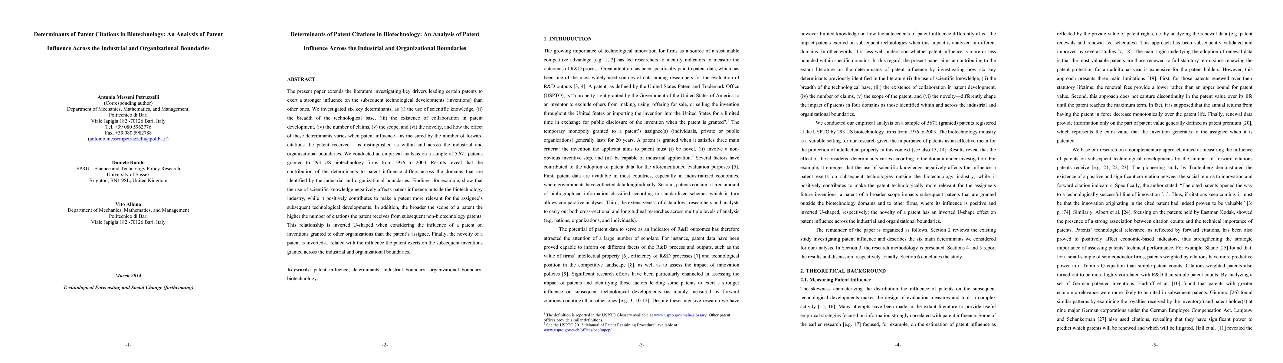 This paper examines six determinants of patent influence in biotechnology, analyzing how their impact varies within and across industrial and organizational boundaries. Findings indicate that factors like scientific knowledge use and patent scope have differing effects on patent citations depending on whether the influence is within or outside the biotechnology industry.