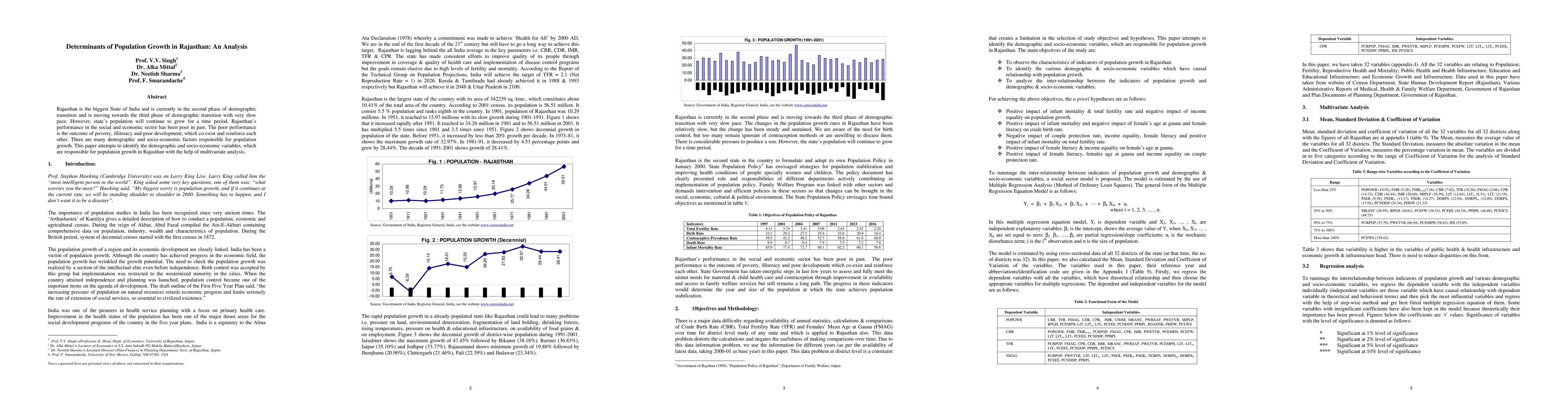 Rajasthan is the biggest State of India and is currently in the second phase of demographic transition and is moving towards the third phase of demographic transition with very slow pace. However, state's population will continue to grow for a time period. Rajasthan's performance in the social and economic sector has been poor in past. The poor performance is the outcome of poverty, illiteracy and poor development, which co-exist and reinforce each other. There are many demographic and socio-economic factors responsible for population growth. This paper attempts to identify the demographic and socio-economic variables, which are responsible for population growth in Rajasthan with the help of multivariate analysis.
