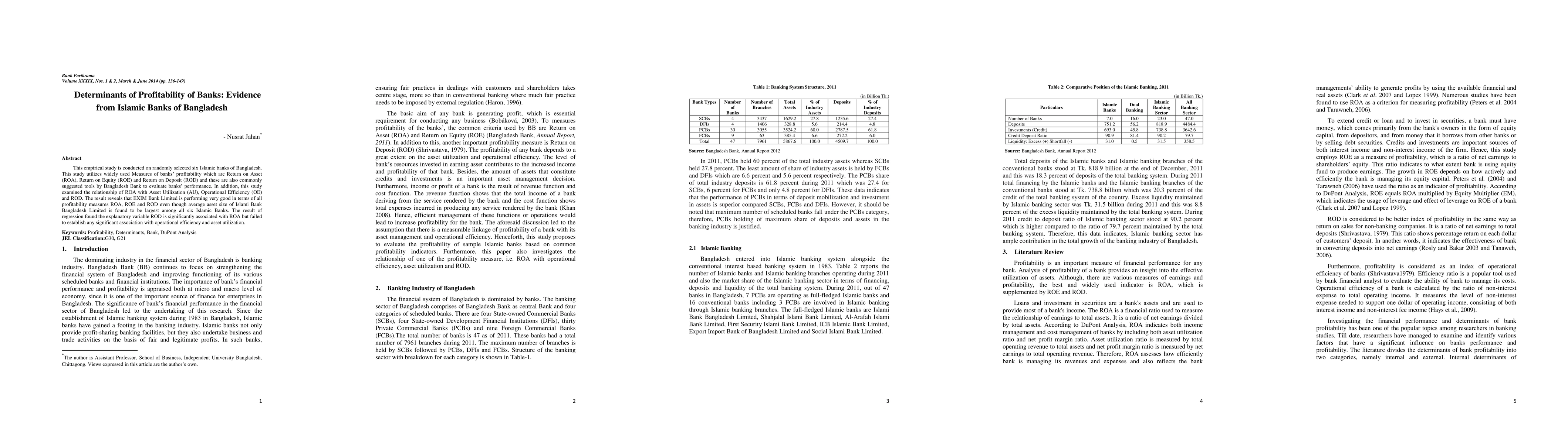 This study evaluates the profitability of six Islamic banks in Bangladesh using ROA, ROE, and ROD. EXIM Bank Limited shows superior performance across all measures, while ROD significantly influences ROA but does not correlate with operational efficiency or asset utilization.