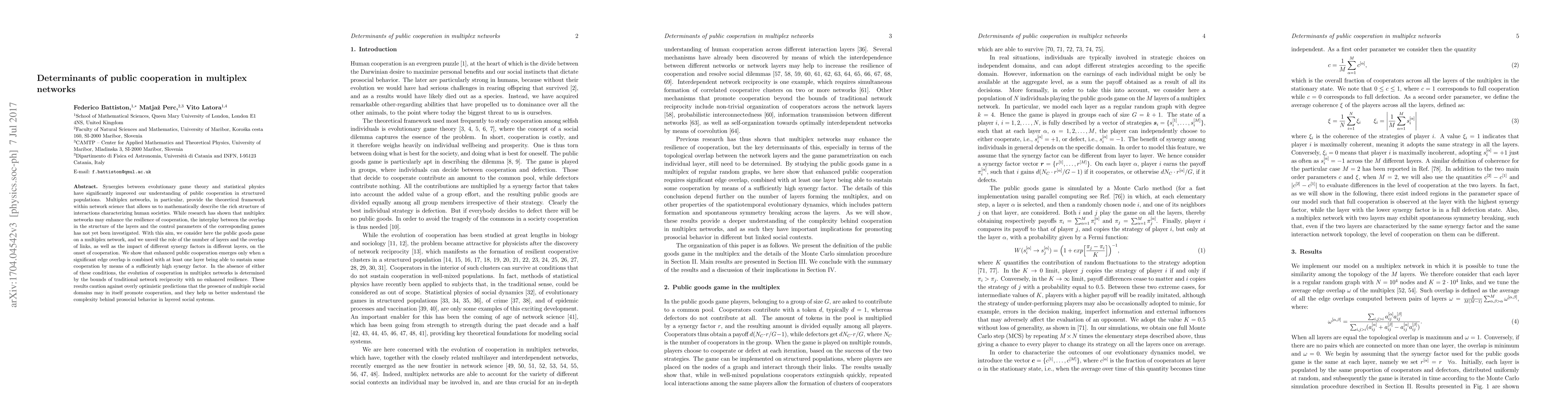 This study explores how public cooperation emerges in multiplex networks using evolutionary game theory, revealing that significant edge overlap and a high synergy factor in at least one layer are crucial for enhanced cooperation, challenging the notion that multiple social domains inherently promote cooperation.