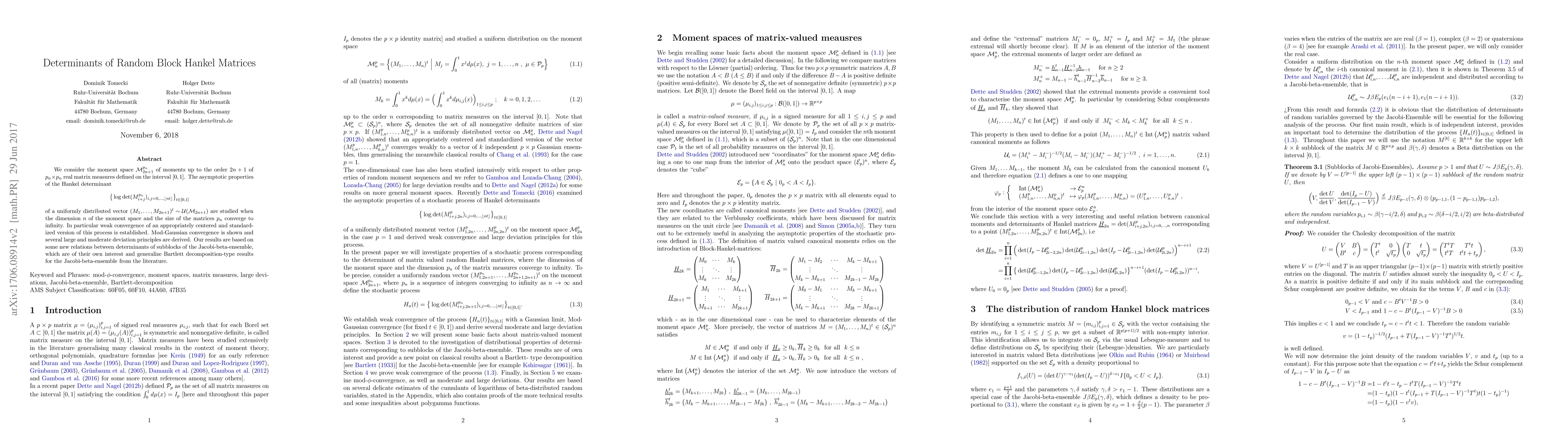 We consider the moment space $\mathcal{M}^{p}_{2n+1}$ of moments up to the order $2n + 1$ of $p_n\times p_n$ real matrix measures defined on the interval $[0,1]$. The asymptotic properties of the Hankel determinant $\{\log\det (M_{i+j}^{p_n})_{i,j=0,\ldots,\lfloor nt\rfloor}\}_{t\in [0,1]}$ of a uniformly distributed vector $(M_1,\dots ,M_{2n+1})^t\sim\mathcal{U}(\mathcal{M}_{2n+1})$ are studied when the dimension $n$ of the moment space and the size of the matrices $p_n$ converge to infinity. In particular weak convergence of an appropriately centered and standardized version of this process is established. Mod-Gaussian convergence is shown and several large and moderate deviation principles are derived. Our results are based on some new relations between determinants of subblocks of the Jacobi-beta-ensemble,which are of their own interest and generalize Bartlett decomposition-type results for the Jacobi-beta-ensemble from the literature.