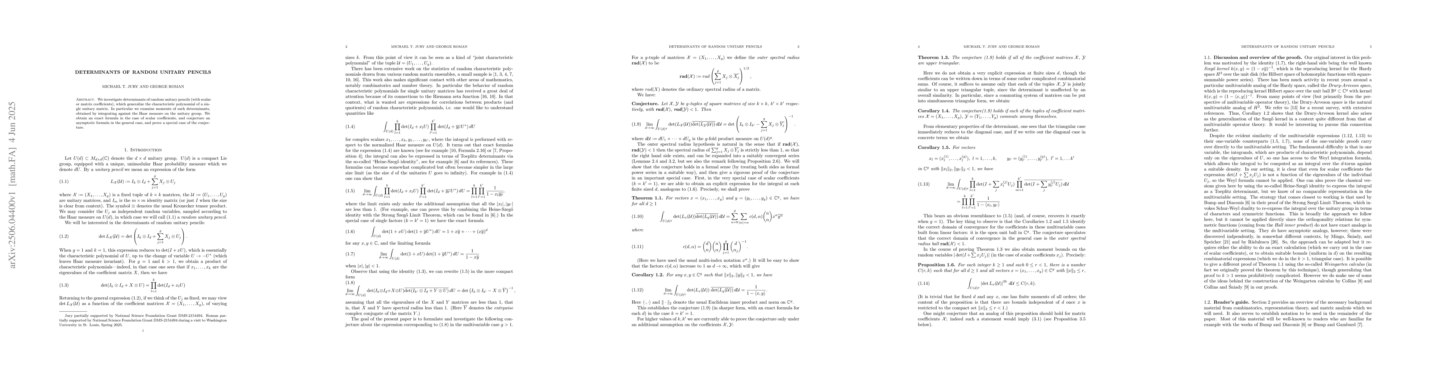 Provides an exact formula for determinants of random unitary pencils with scalar coefficients and an asymptotic formula conjecture for the general case.