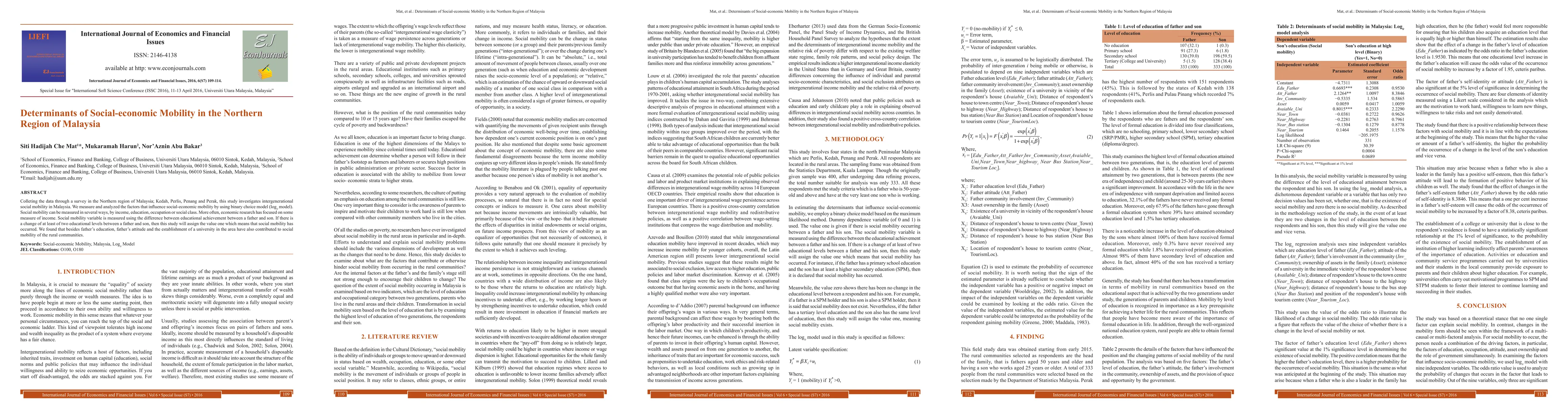 This study provides new insights into the determinants of social mobility in Malaysia using a logit model with nine independent variables.