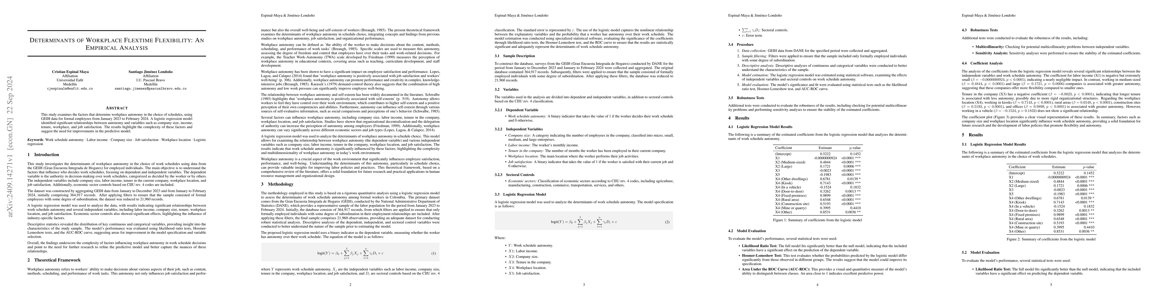 This study investigates determinants of workplace flextime using a logistic regression model on GEIH data, finding significant links between schedule autonomy and company size, income, tenure, workplace environment, and job satisfaction, while noting the complexity of these factors and the need for model enhancements.