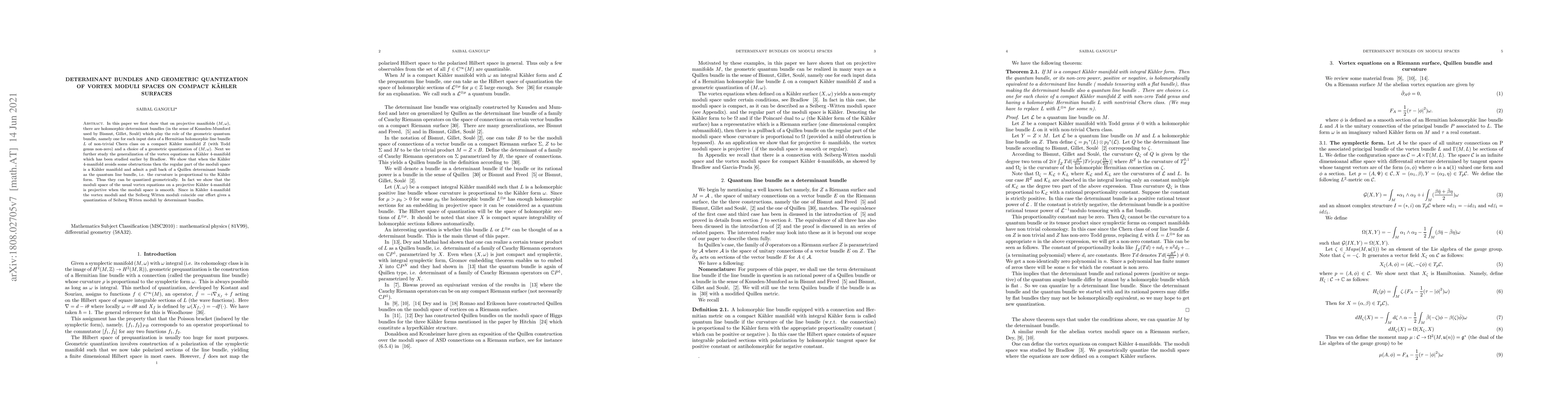 In this paper we first show that on projective manifolds (M, {\omega}), there are holomorphic determinant bundles (in the sense of Knusden-Mumford used by Bismut, Gillet, Soule) which play the role of the geometric quantum bundle, namely one for each input data of a Hermitian holomorphic line bundle L of non-trivial Chern class on a compact Kahler manifold Z (with Todd genus non-zero) and a choice of a geometric quantization of (M, {\omega}). Next we further study the generalization of the vortex equations on Kahler 4-manifold which has been studied earlier by Bradlow. We show that when the Kahler 4-manifold avoids some obstructions then the regular part of the moduli space is a Kahler manifold and admit a pull back of a Quillen determinant bundle as the quantum line bundle, i.e. the curvature is proportional to the Kahler form. Thus they can be quantized geometrically. In fact we show that the moduli space of the usual vortex equations on a projective Kahler 4-manifold is projective when the moduli space is smooth. Since in Kahler 4-manifold the vortex moduli and the Seiberg Witten moduli coincide our effort gives a quantization of Seiberg Witten moduli by determinant bundles