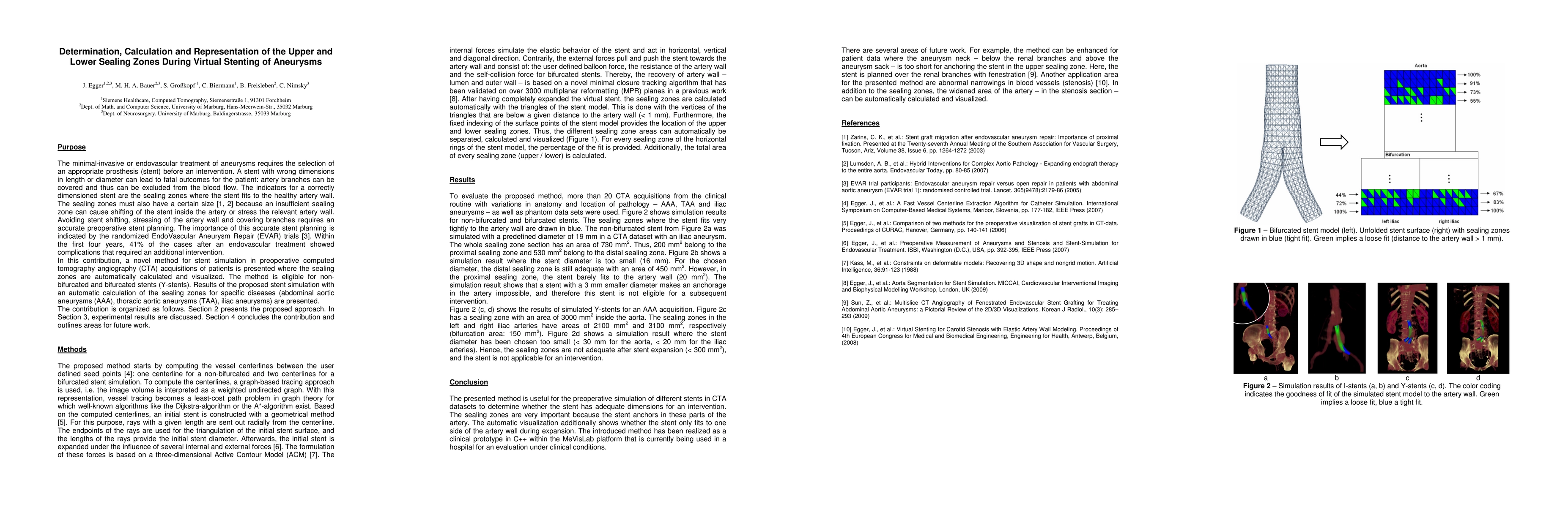 In this contribution, a novel method for stent simulation in preoperative computed tomography angiography (CTA) acquisitions of patients is presented where the sealing zones are automatically calculated and visualized. The method is eligible for non-bifurcated and bifurcated stents (Y-stents). Results of the proposed stent simulation with an automatic calculation of the sealing zones for specific diseases (abdominal aortic aneurysms (AAA), thoracic aortic aneurysms (TAA), iliac aneurysms) are presented. The contribution is organized as follows. Section 2 presents the proposed approach. In Section 3, experimental results are discussed. Section 4 concludes the contribution and outlines areas for future work.