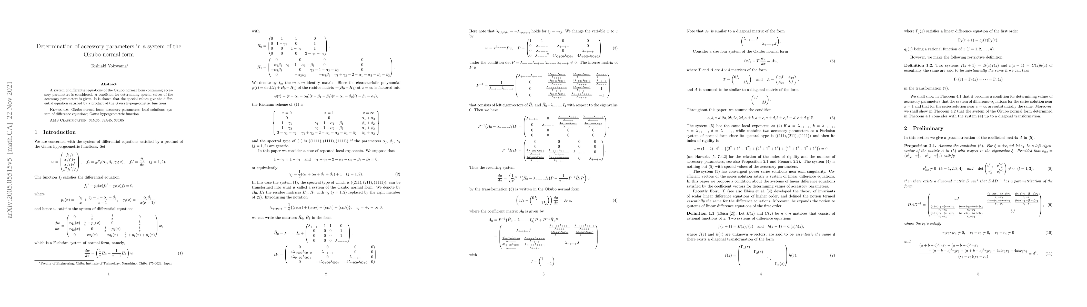 Summary: This paper explores a system of differential equations in Okubo normal form with accessory parameters, providing a condition to determine special values of these parameters. It demonstrates that these special values lead to a differential equation satisfied by a product of Gauss hypergeometric functions.
