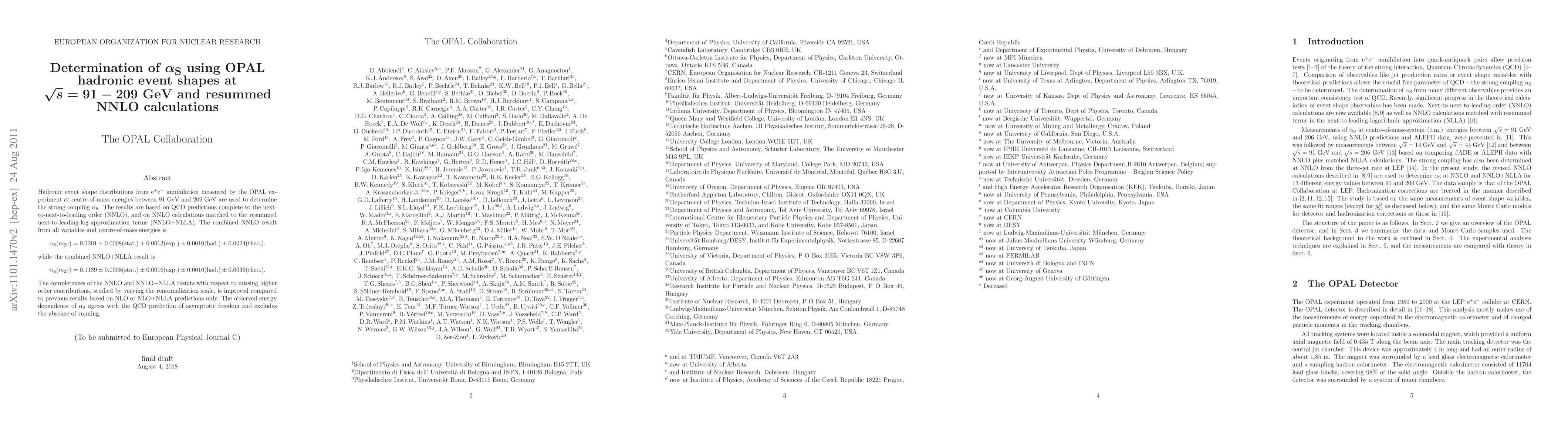 Hadronic event shape distributions from e+e- annihilation measured by the OPAL experiment at centre-of-mass energies between 91 GeV and 209 GeV are used to determine the strong coupling {\alpha}S. The results are based on QCD predictions complete to the next-to- next-to-leading order (NNLO), and on NNLO calculations matched to the resummed next-to-leading-log-approximation terms (NNLO+NLLA). The combined NNLO result from all variables and centre-of-mass energies is {\alpha}S(mZ0) = 0.1201 {\pm} 0.0008(stat.) {\pm} 0.0013(exp.) {\pm} 0.0010(had.) {\pm} 0.0024(theo.). while the combined NNLO+NLLA result is {\alpha}S(mZ0) = 0.1189 {\pm} 0.0008(stat.) {\pm} 0.0016(exp.) {\pm} 0.0010(had.) {\pm} 0.0036(theo.). The completeness of the NNLO and NNLO+NLLA results with respect to missing higher order contributions, studied by varying the renormalization scale, is improved compared to previous results based on NLO or NLO+NLLA predictions only. The observed energy dependence of {\alpha}S agrees with the QCD prediction of asymptotic freedom and excludes the absence of running.
